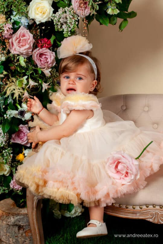 Rochiță creață, cu straturi jucăușe, din tull colorate în culori delicioase, diferite straturi suprapuse în degrade pentru un plus de fantezie.