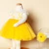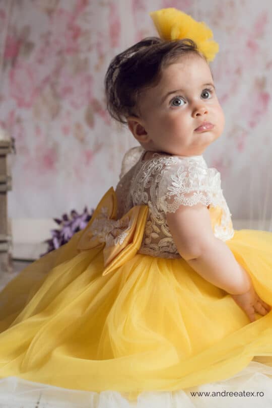 Compleul conține 4 piese: rochiță, bentiță cu pampon din tull, bolero și fundiță detașabilă.