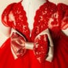 Spatele este în V, accentuat de dantelă cu forme organice, iar ca punct central este îmbogățit cu o fundă dublă jucăușă.