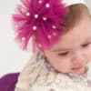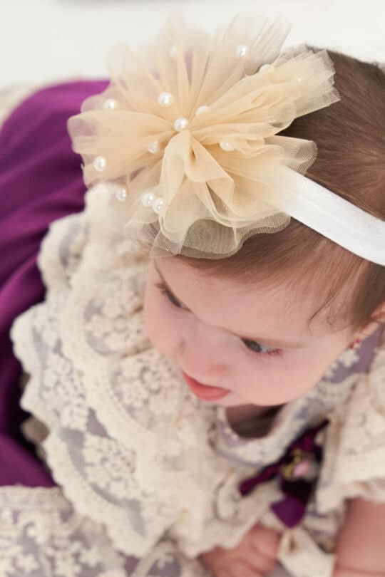Bentiță floare din multe straturi pufoase de tull, cu suport de dantelă și perluțe accent în mijlocul florii de tull.