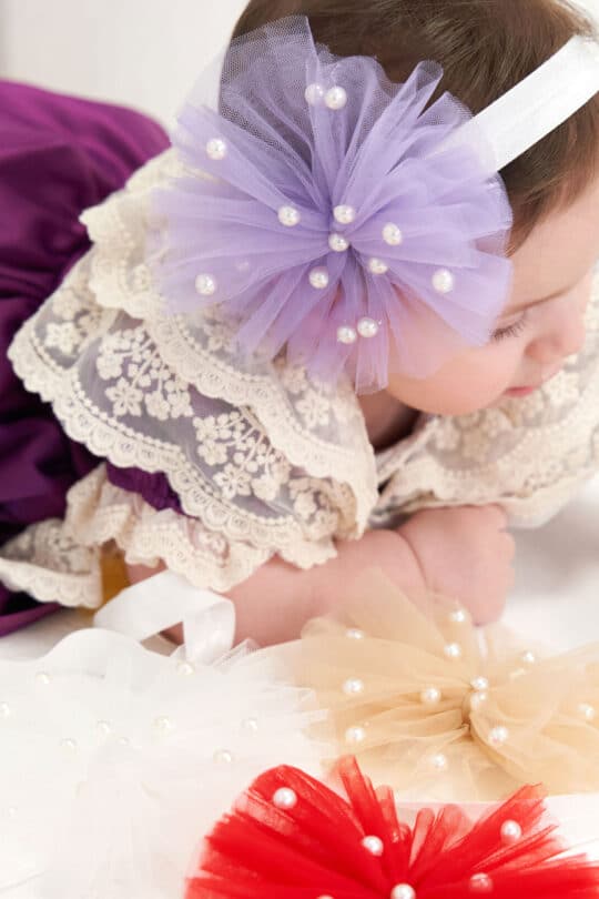 Bentiță floare din multe straturi pufoase de tull, cu suport de dantelă și perluțe accent în mijlocul florii de tull.