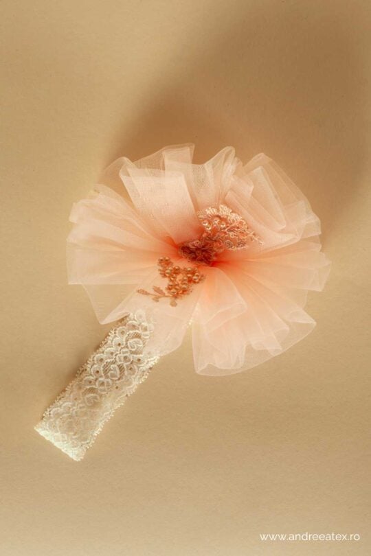Bentiță floare din multe straturi pufoase de tull, cu suport de dantelă și perluțe accent în mijlocul florii de tull.