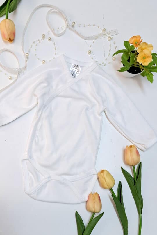 Croi petrecut în față cu capse între picioare și lateral pentru a fi îmbrăcat cât mai repede și ușor de către bebeluși.