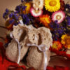 Botoșeii sunt croșetați manual din ață tip macrame, firele moi sunt împletite cu delicatețe, ca șirețel au o fundiță din satin fină ce le completează ținuta, fiind delimitați pe margini de mici mărgeluțe gingașe.