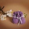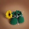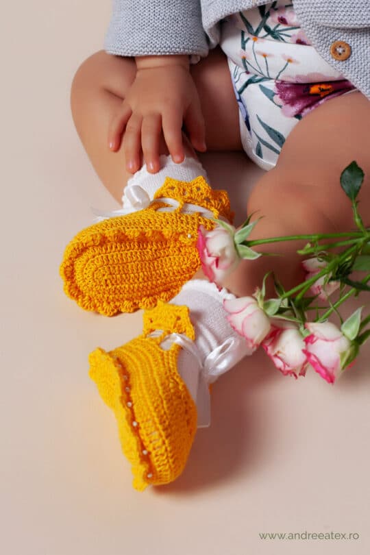 Botoșeii sunt croșetați manual din ață tip macrame, firele moi sunt împletite cu delicatețe, ca șirețel au o fundiță din satin fină ce le completează ținuta, fiind delimitați pe margini de mici mărgeluțe gingașe.