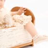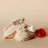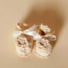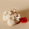 Botoșeii sunt croșetați manual din ață tip macrame, firele moi sunt împletite cu delicatețe, ca șirețel au o fundiță din satin fină ce le completeaza ținuta, iar ca detaliu central au o floricică creață cu petale.