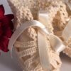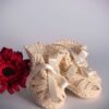 Botoșeii sunt croșetați manual din ață tip macrame sub forma unei săndăluțe. Firele moi sunt împletite cu delicatețe, ca șirețel au o fundiță din satin fină ce le completează ținuta, fiind delimitați pe margini de mici mărgeluțe gingașe.