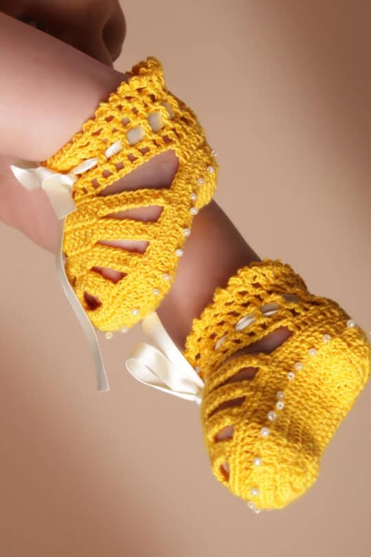 Botoșeii sunt croșetați manual din ață tip macrame sub forma unei săndăluțe. Firele moi sunt împletite cu delicatețe, ca șirețel au o fundiță din satin fină ce le completează ținuta, fiind delimitați pe margini de mici mărgeluțe gingașe.