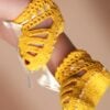 Botoșeii sunt croșetați manual din ață tip macrame sub forma unei săndăluțe. Firele moi sunt împletite cu delicatețe, ca șirețel au o fundiță din satin fină ce le completează ținuta, fiind delimitați pe margini de mici mărgeluțe gingașe.