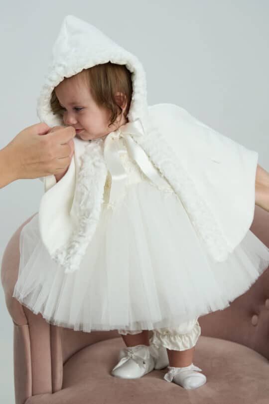 Capa are ca detalii o fundă de satin și doi nasturi croșetați manual care creează mânecuțe și fac utilizarea și îmbrăcarea micilor prințese foarte facilă.
