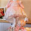 Caroline este o rochiță princiară; rochița are trenă, fusta este alcătuită din tull jucăuș conturat de broderii mari din dantelă.