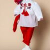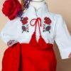 Costumul de botez conține 4 piese: pantaloni, sacou, cămașă ie din pânză topită cu broderie, pălăriuță.