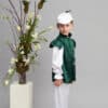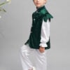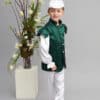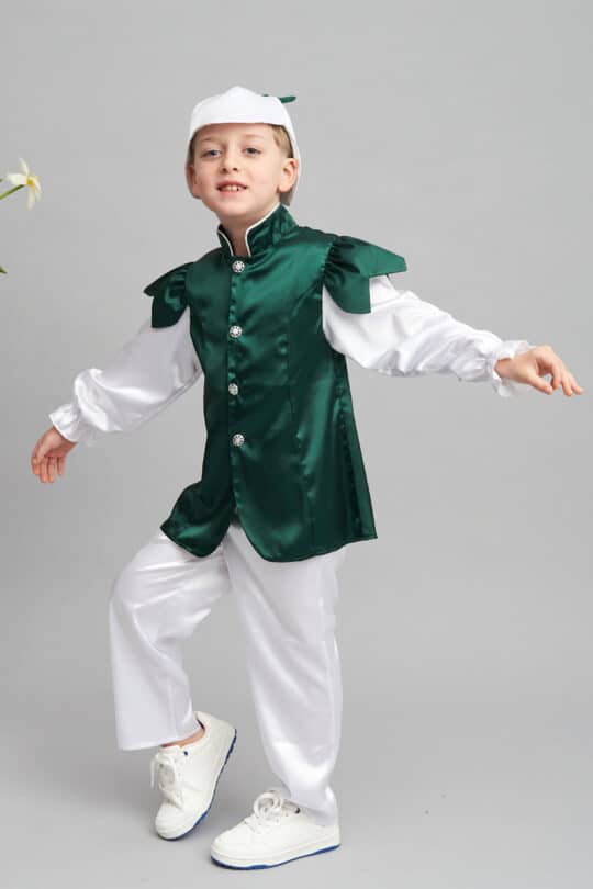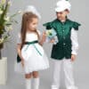 Costum este lucrat din satin moale, alb și verde.