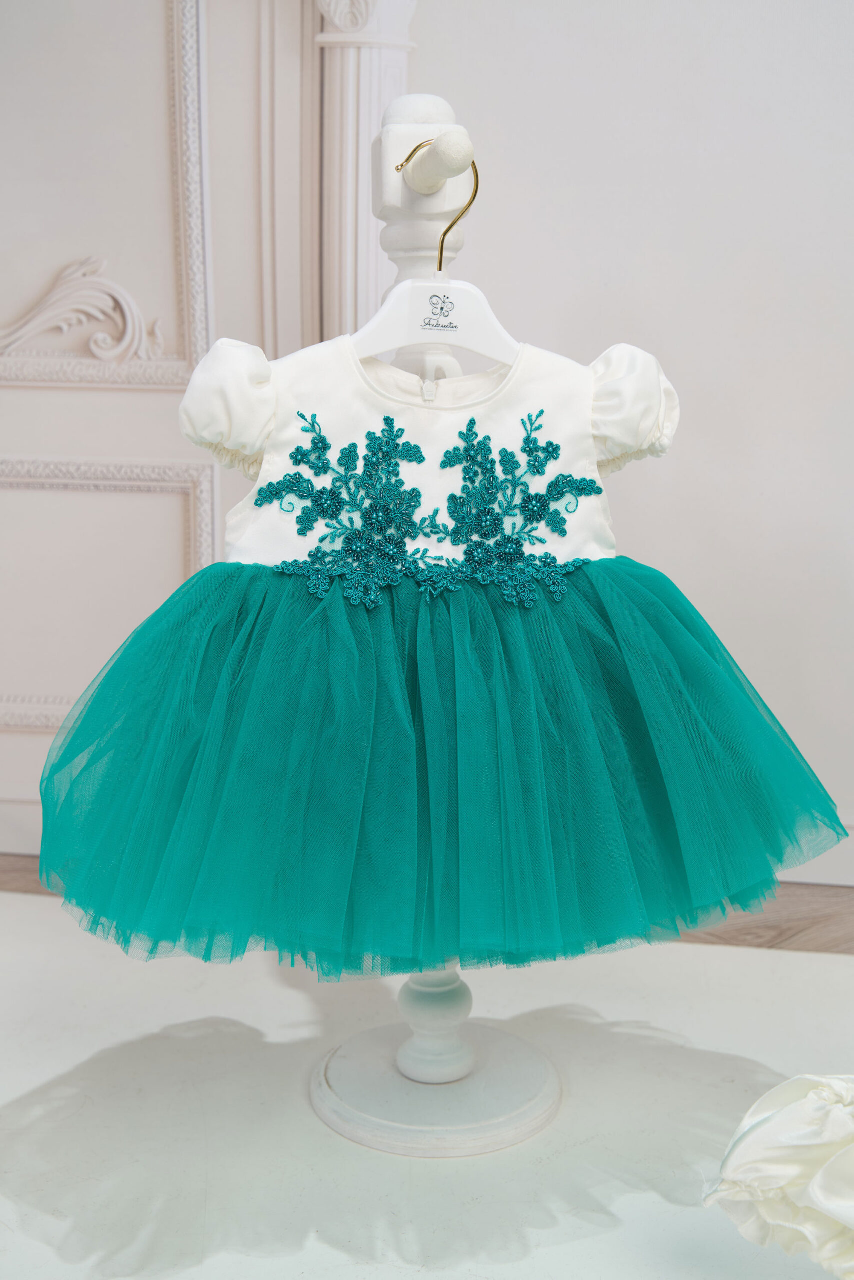 Este o rochiță manufacturată din tafta și multe straturi crețe de tull.