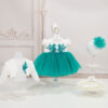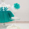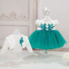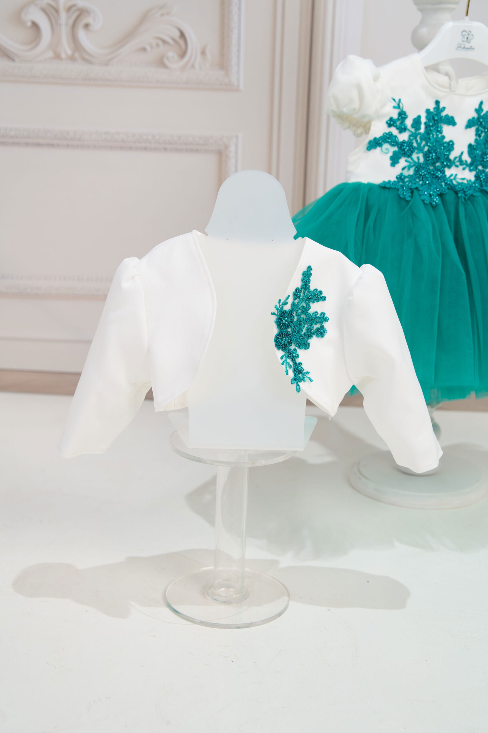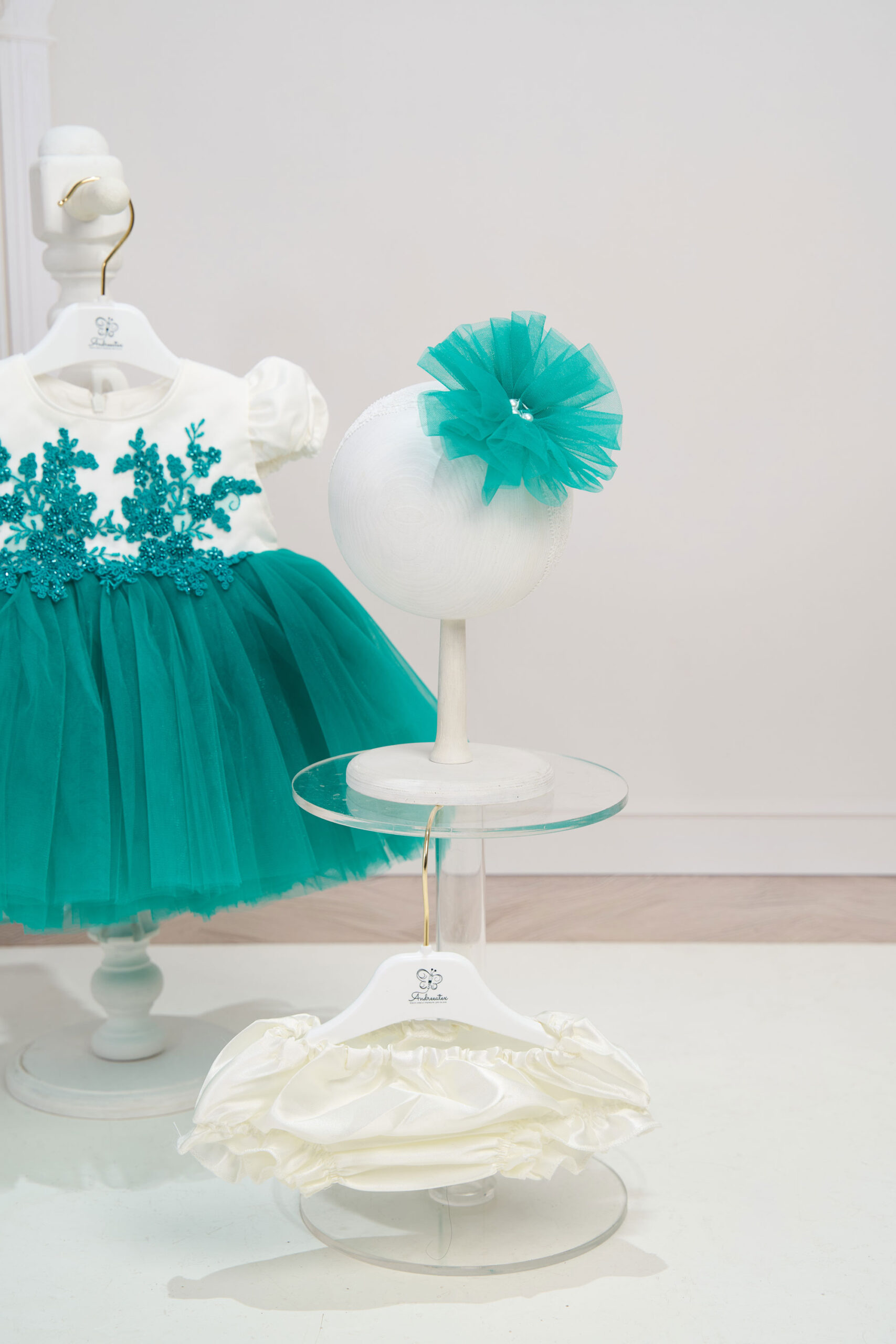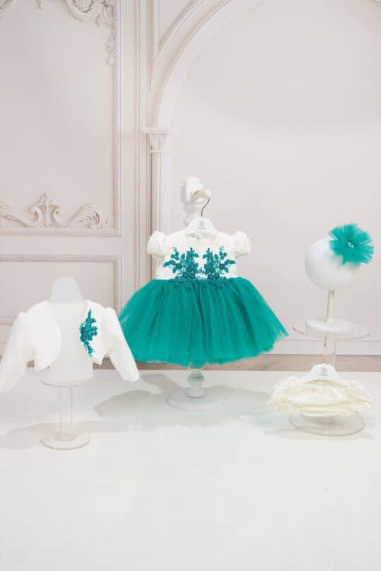 Compleul conține 4 piese: rochiță, bolero, bentiță, chiloței.