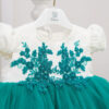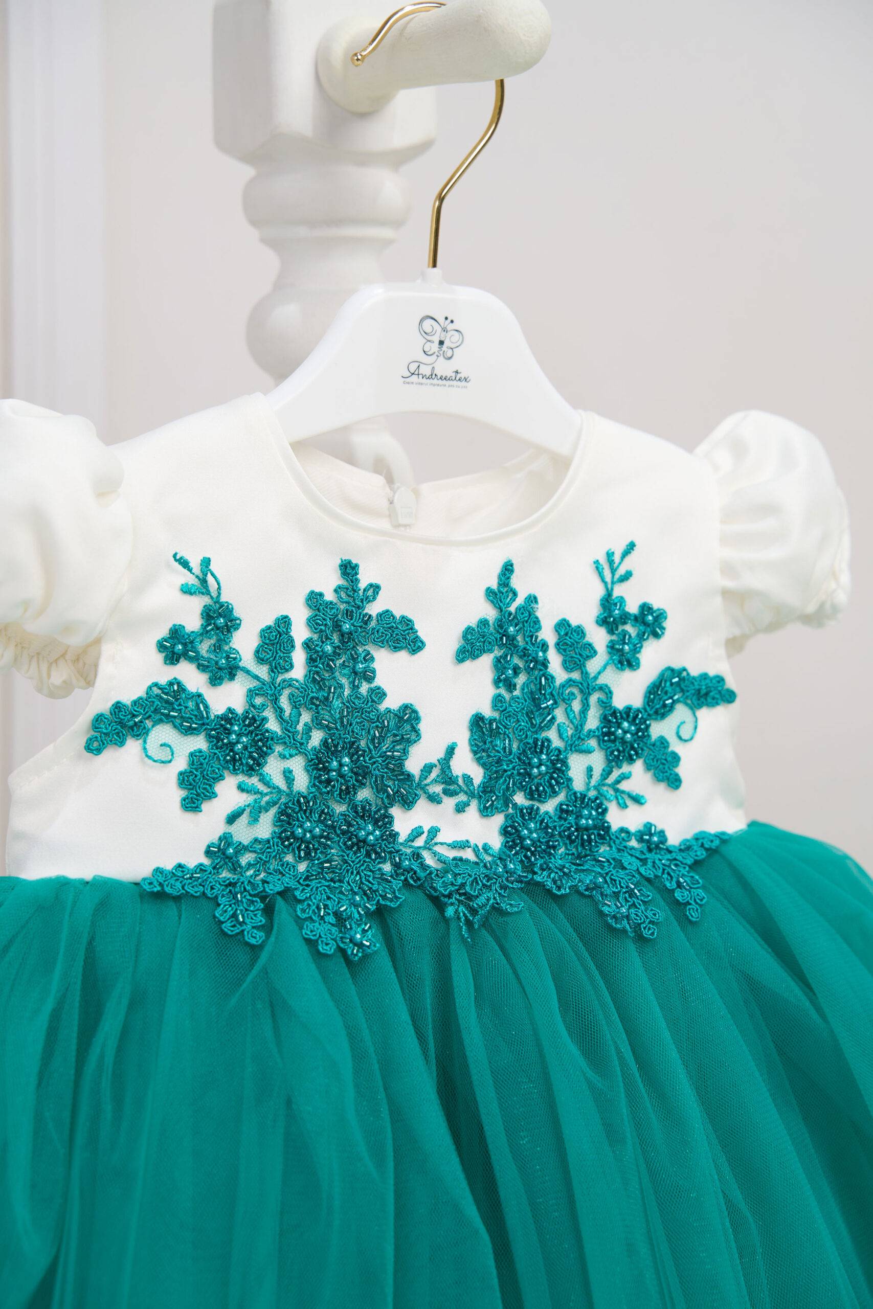 Accentul rochiței este redat cu ajutorul broderiei 3d, organice, florale în culori asortate tullului, broderia urmează linia bustului.