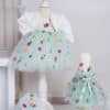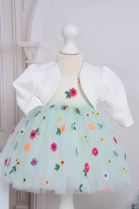 Rochiță manufacturată din tull cu broderie floricele colorate.