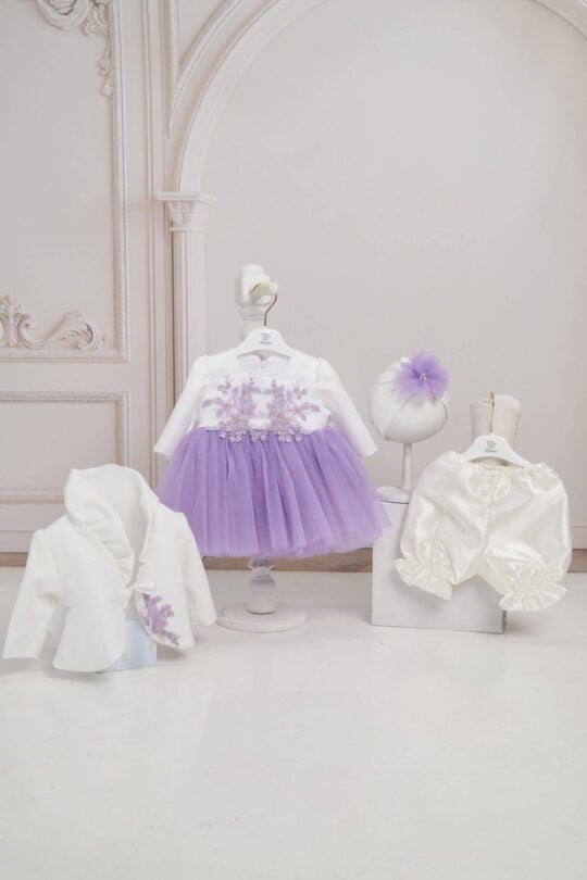 Compleul conține 4 piese: rochiță, bolero, turban, chiloței.