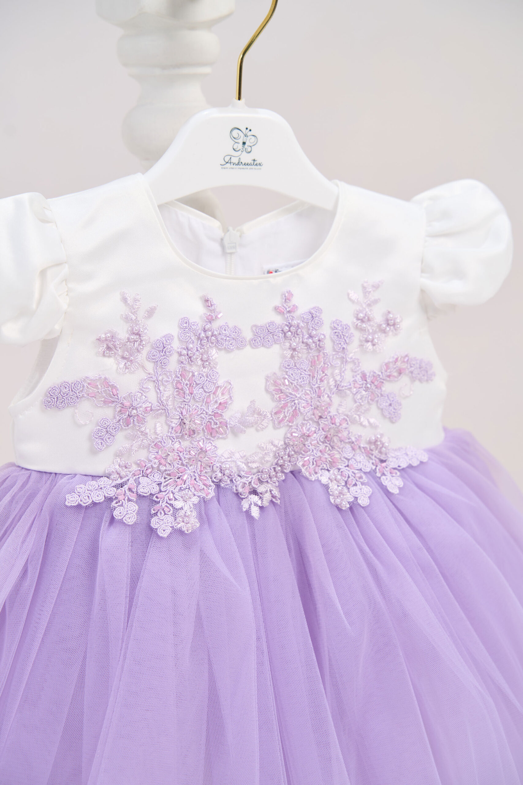 Este o rochiță manufacturată din tafta și multe straturi crețe de tull.