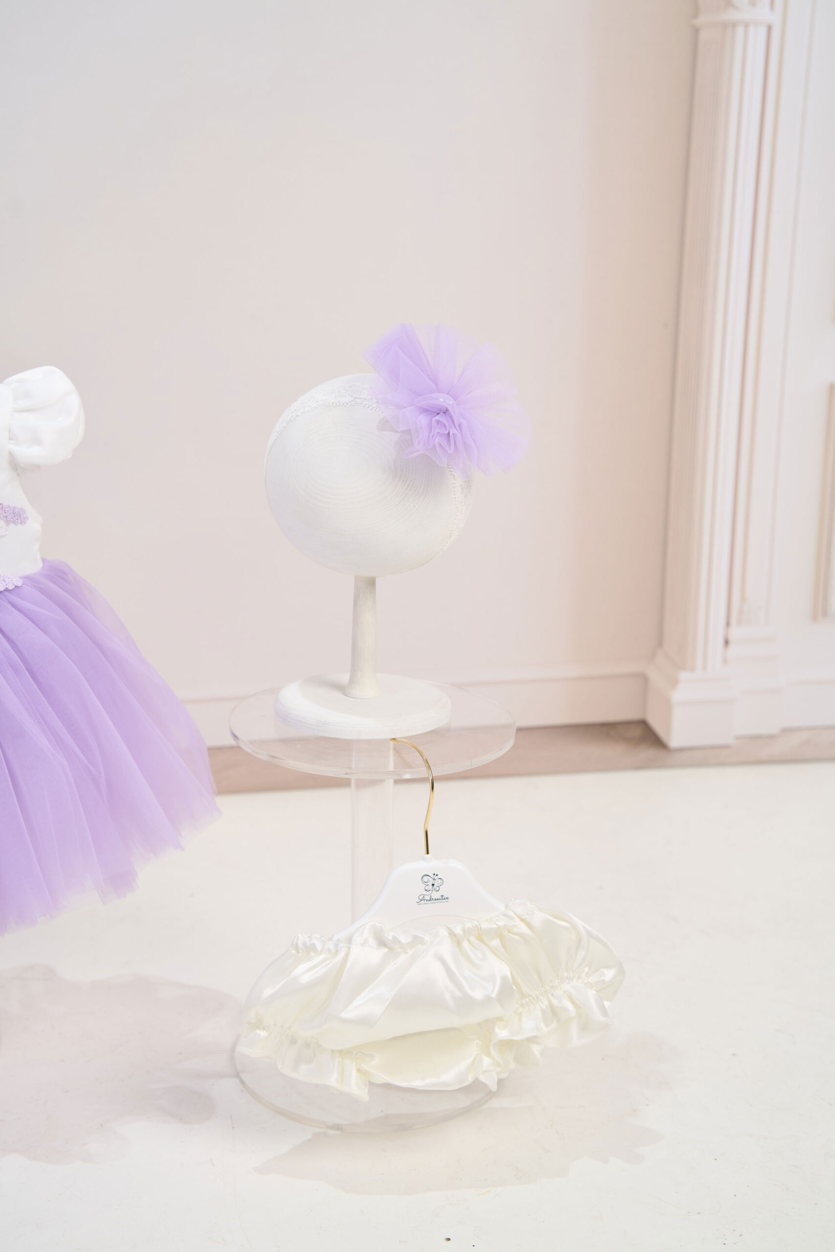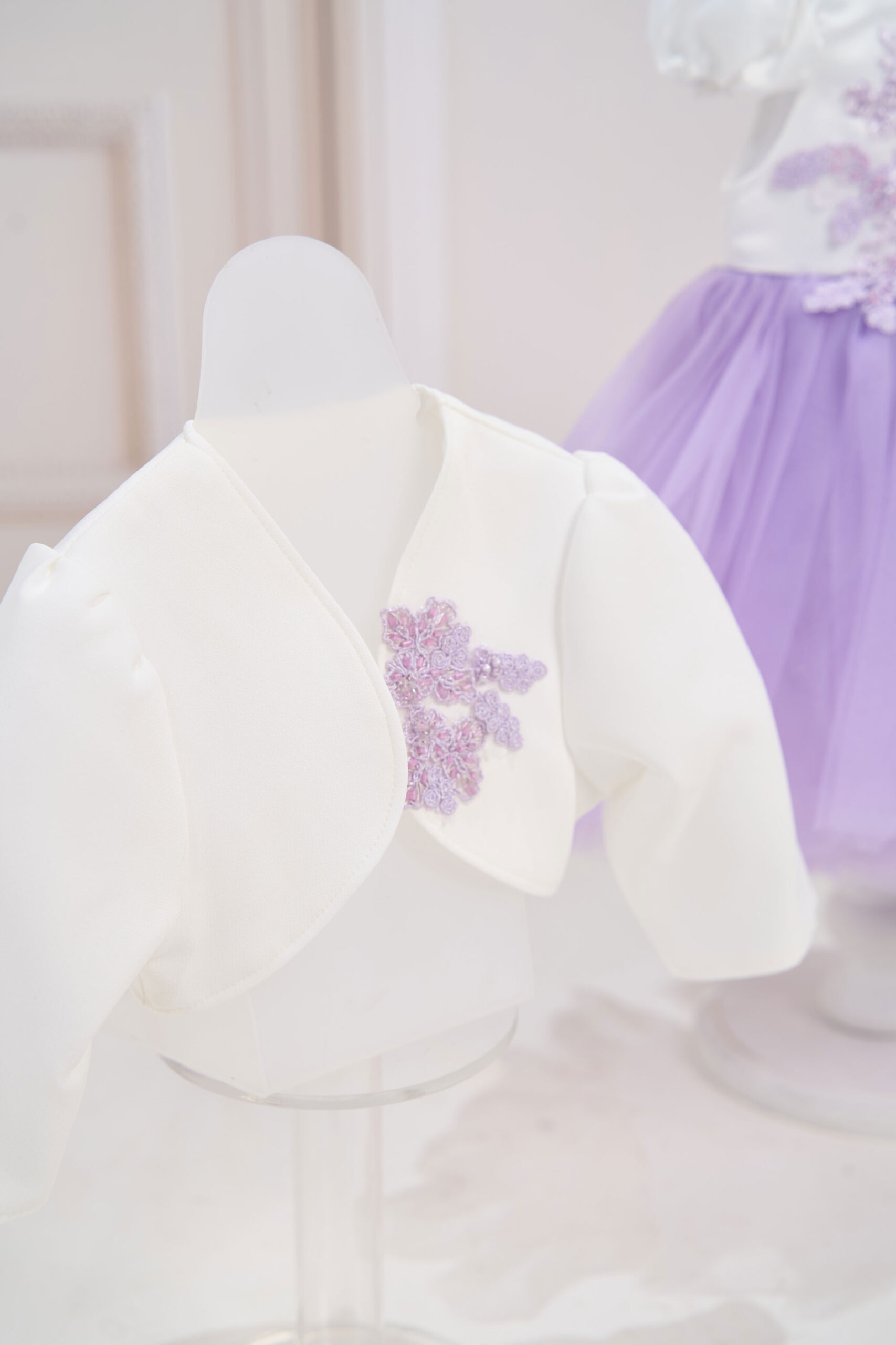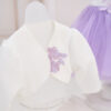 Compleul conține 4 piese: rochiță, bolero, bentiță, chiloței.