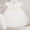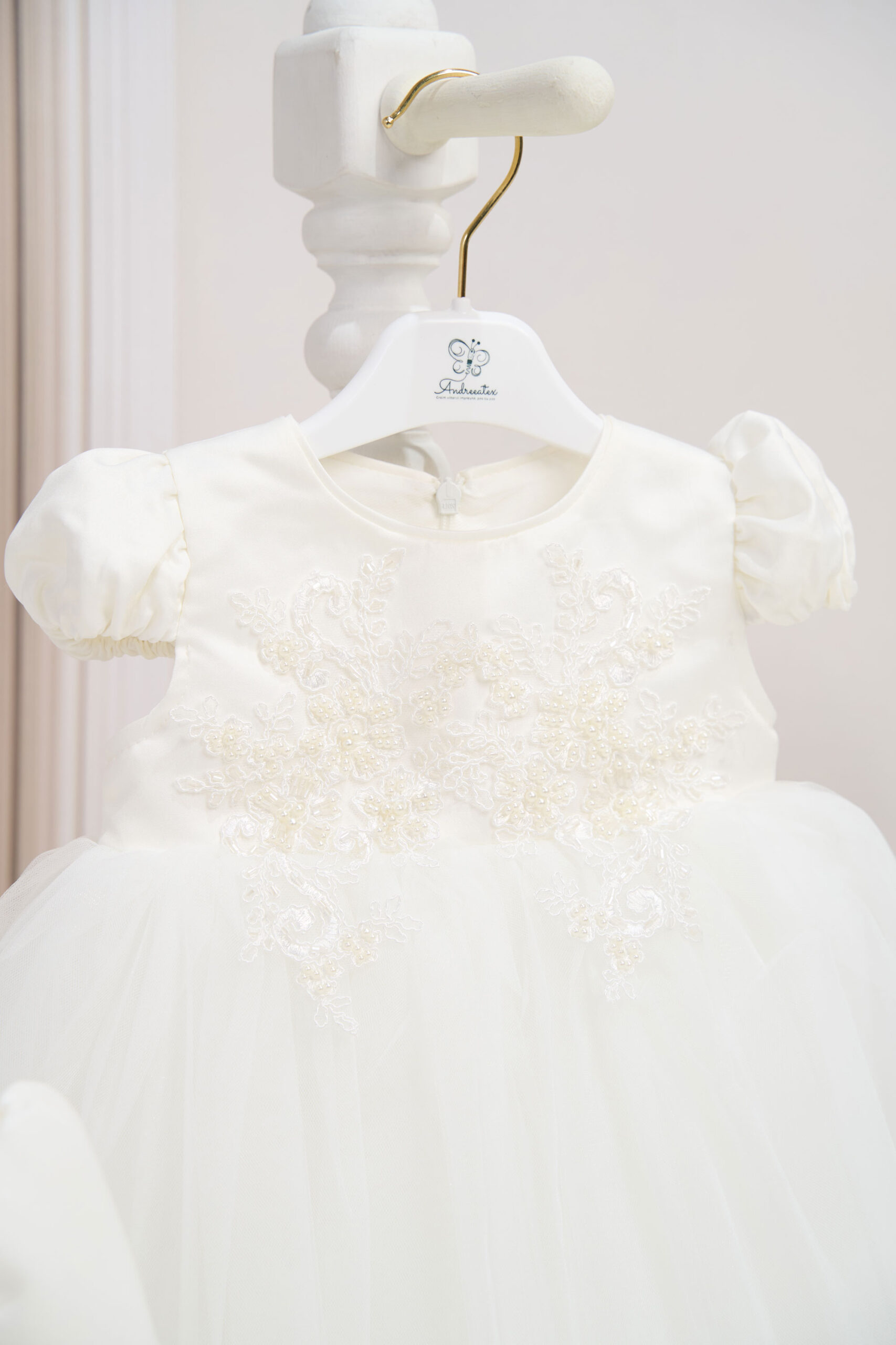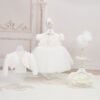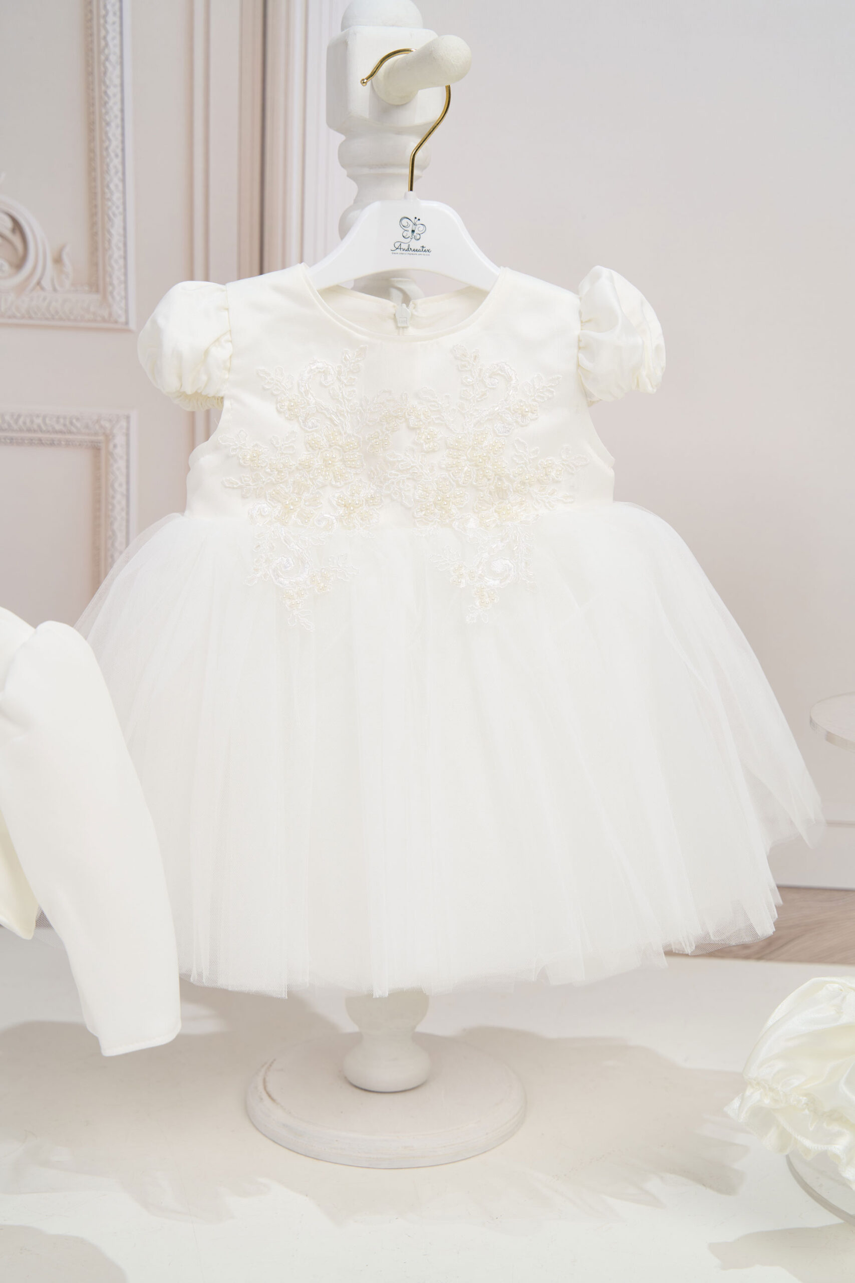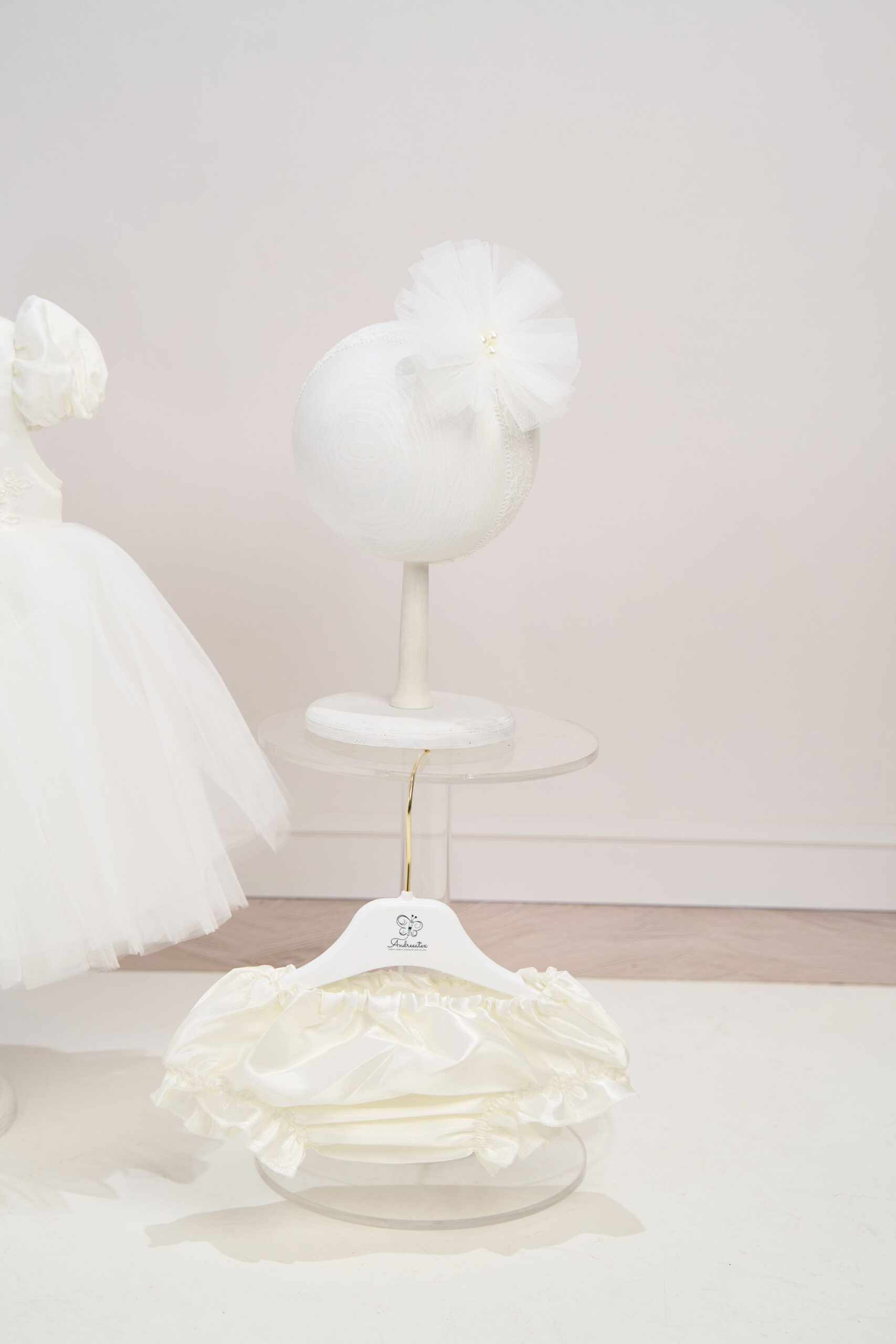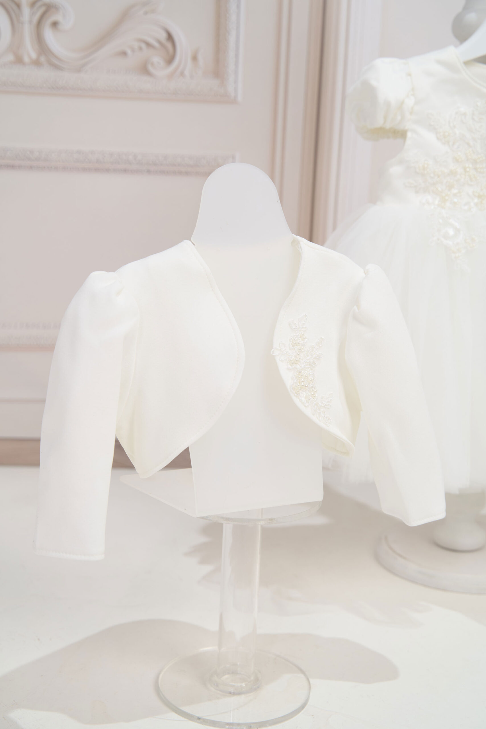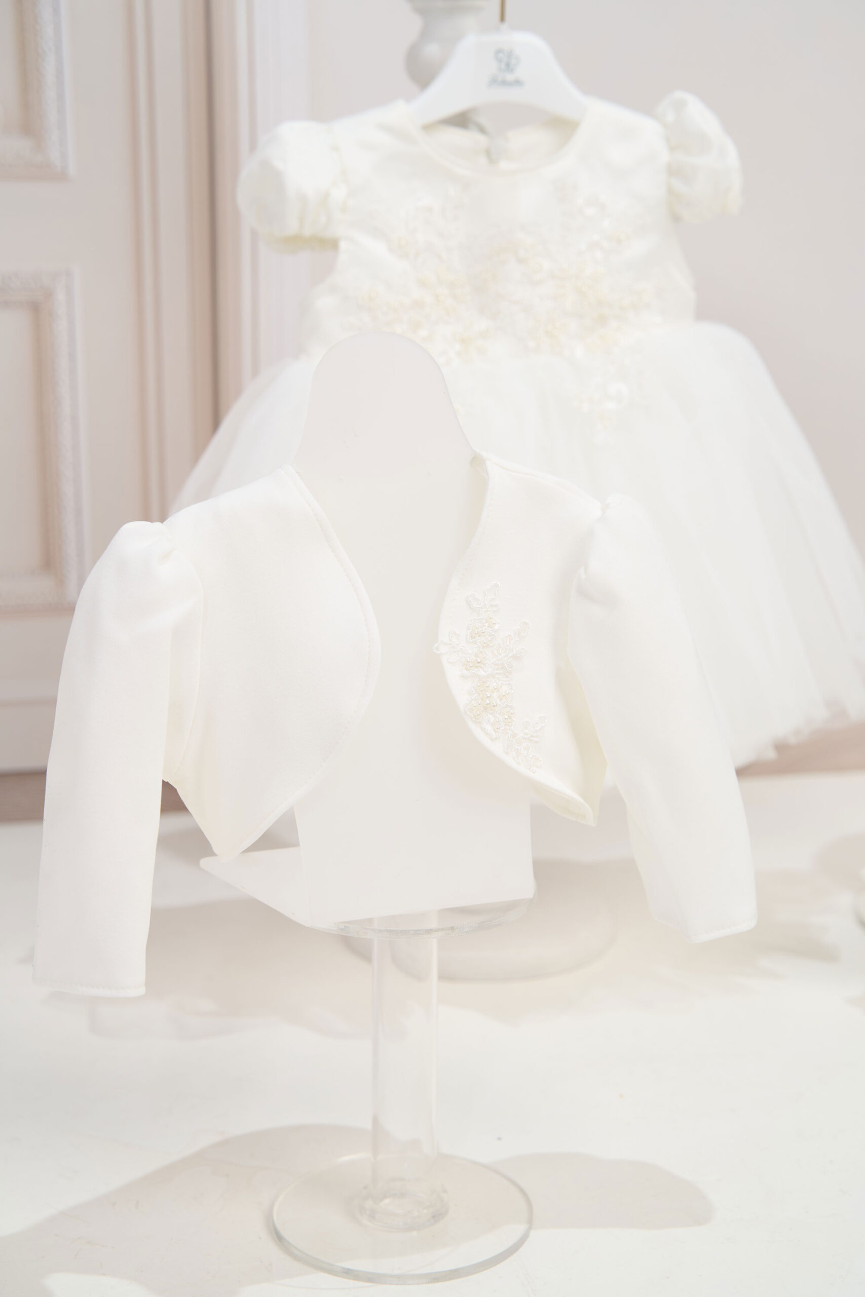 Compleul conține 4 piese: rochiță, bolero, bentiță, chiloței.