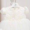 Accentul rochiței este redat cu ajutorul broderiei 3d, organice, florale în culori asortate tullului, broderia urmează linia bustului.