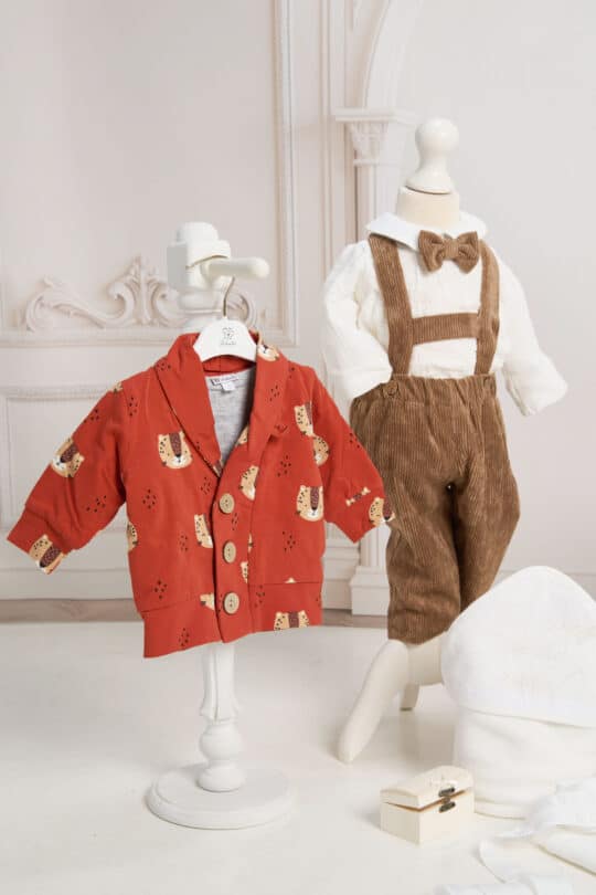 Cardigan cu Imprimeu Animale Marine: Cardiganul din bumbac moale este decorat cu un imprimeu vesel cu ursuleți. Gulerul tip șal și nasturii de lemn adaugă un touch natural și îl fac perfect pentru zilele mai reci. Cu un nasture suplimentar pentru zilele friguroase, micuțul dumneavoastră va fi mereu bine protejat și cu stil.