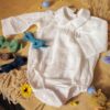Cămașă Tip Body din Muselină: Cămașa tip body este confecționată din muselină delicată și are un design inteligent deschis pe spate, pentru a face îmbrăcarea și dezbrăcarea mai ușoară. Gulerul rotund adaugă o notă de rafinament și stil acestui costum.