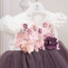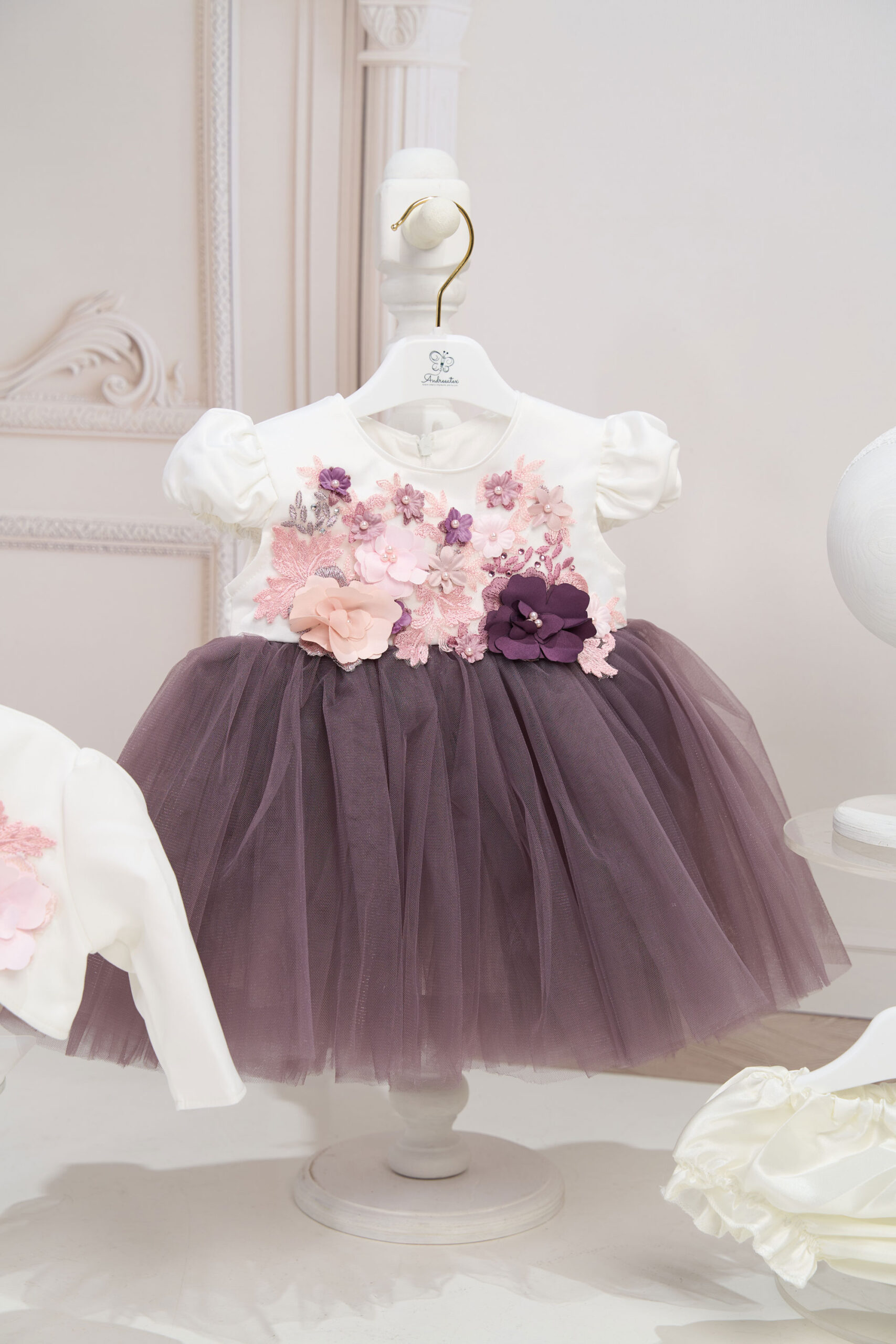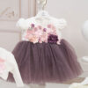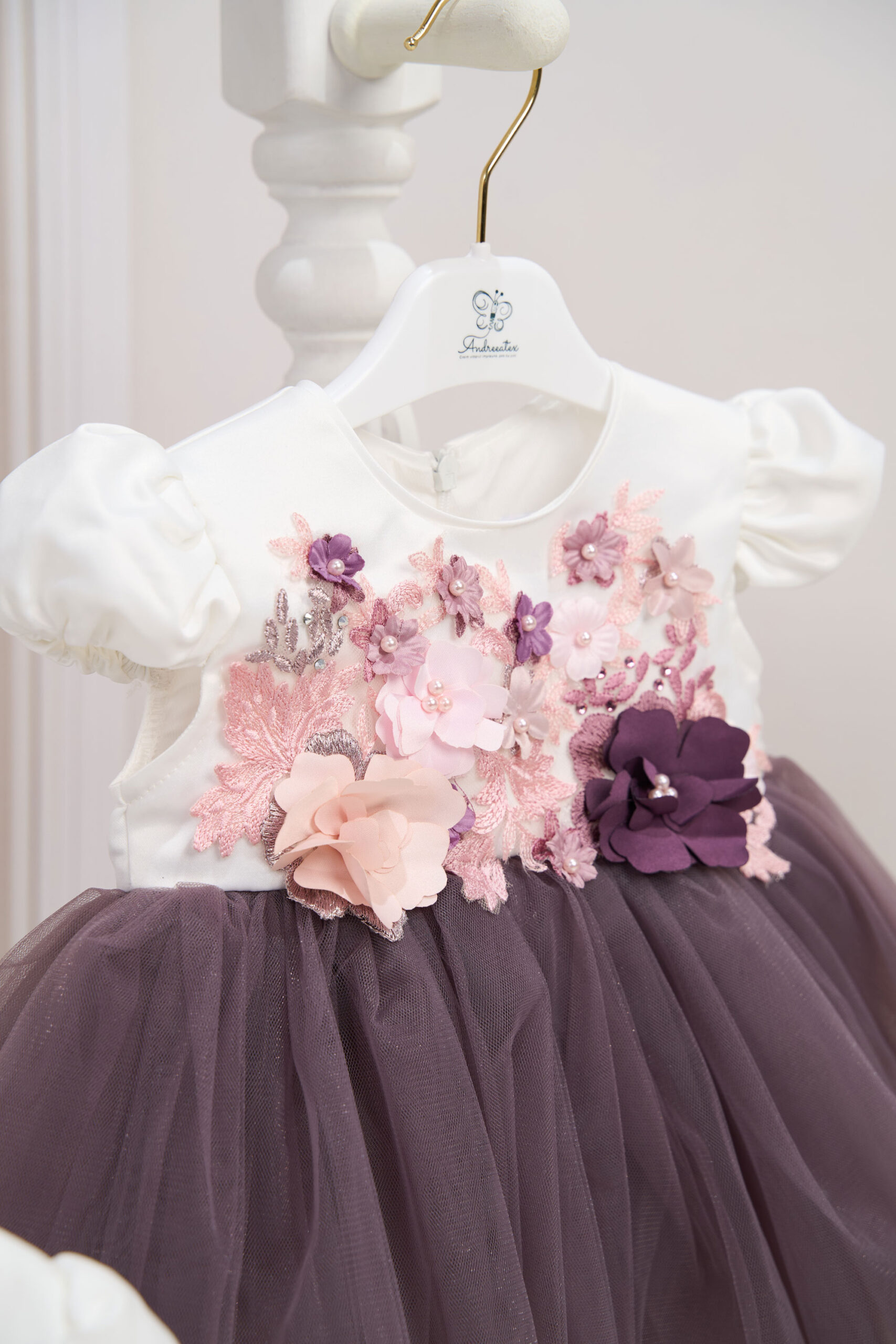 Accentul rochiței este redat cu ajutorul broderiei 3d, organice, florale în culori asortate tullului, broderia urmează linia bustului.