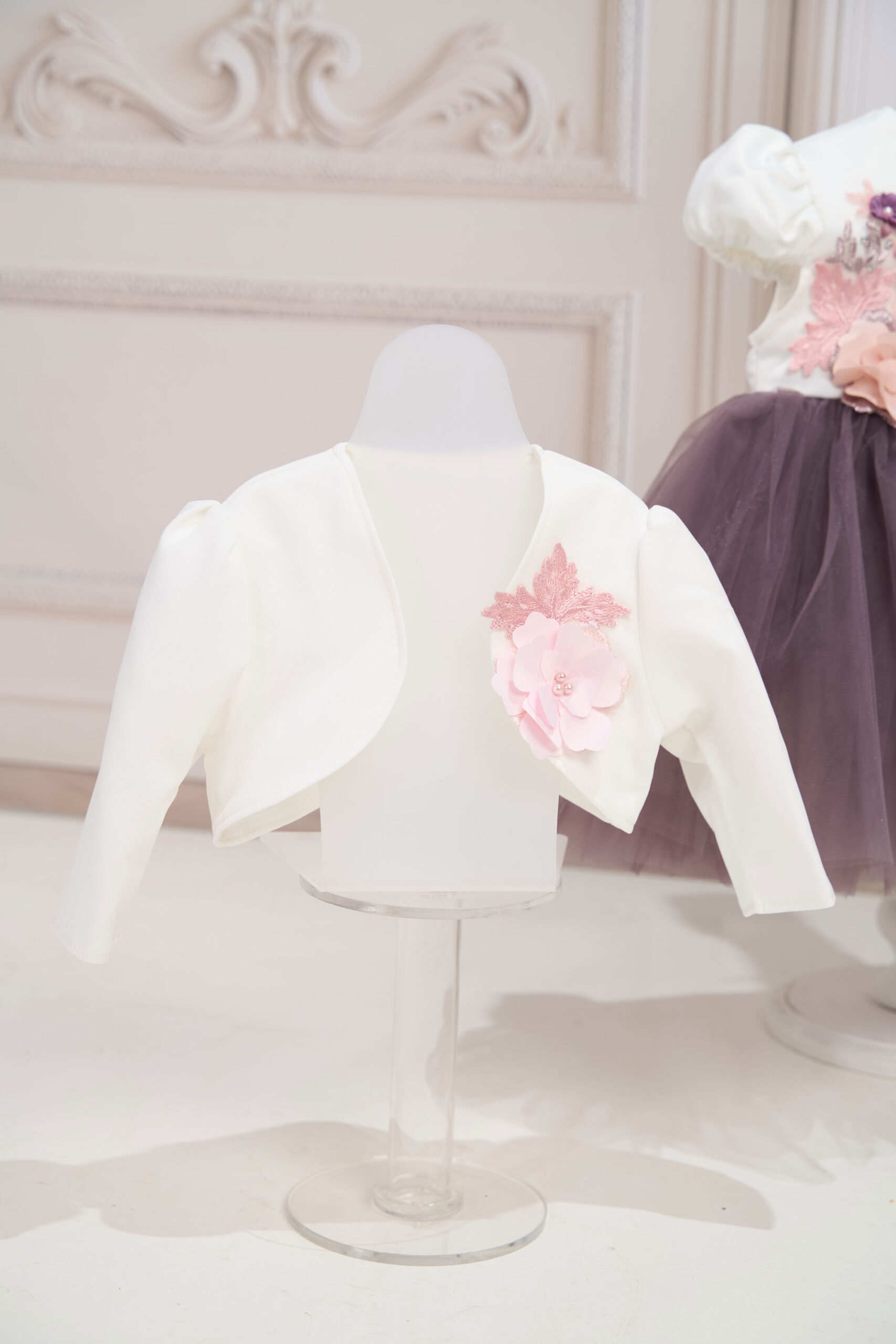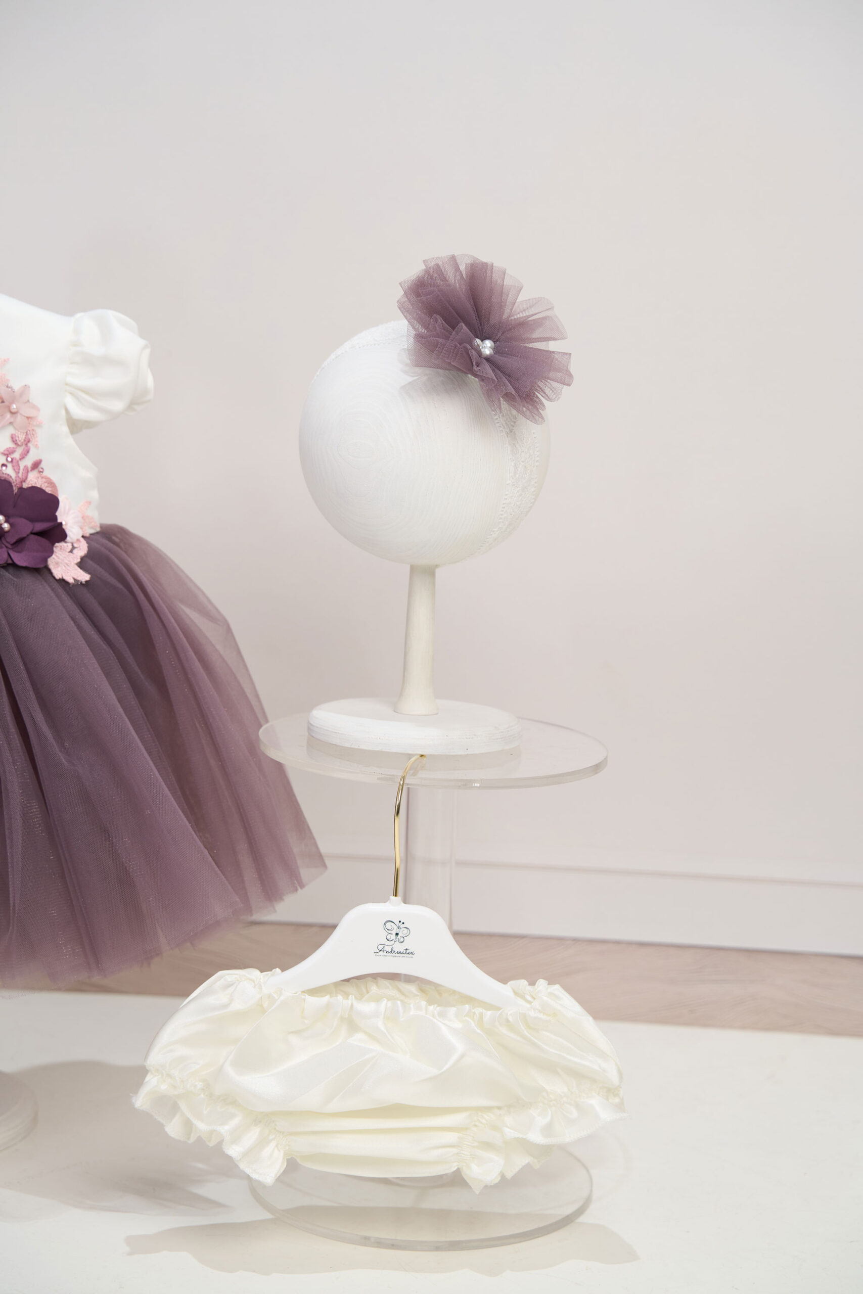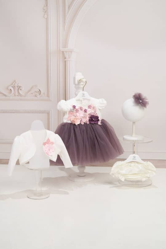 Compleul conține 4 piese: rochiță, bolero, turban, chiloței.