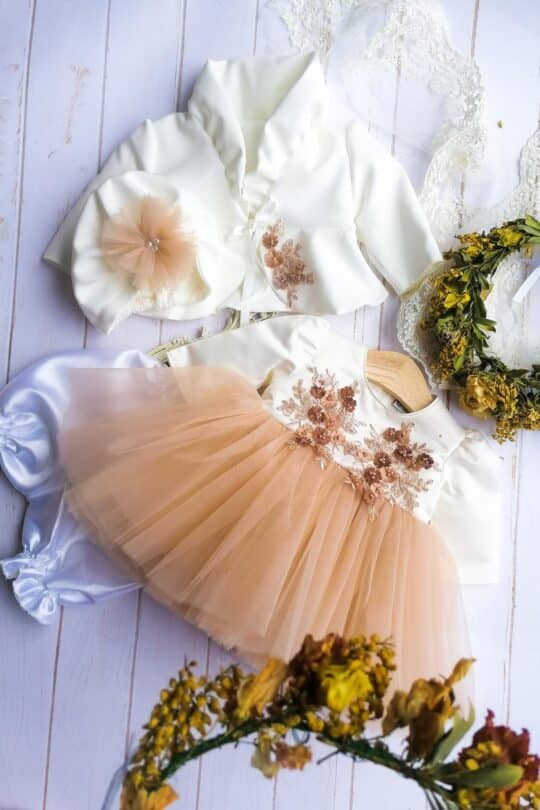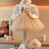 Compleul conține 4 piese: rochiță, bolero, turban, chiloței.