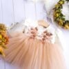 Accentul rochiței este redat cu ajutorul broderiei 3d, organice, florale în culori asortate tullului, broderia urmează linia bustului.