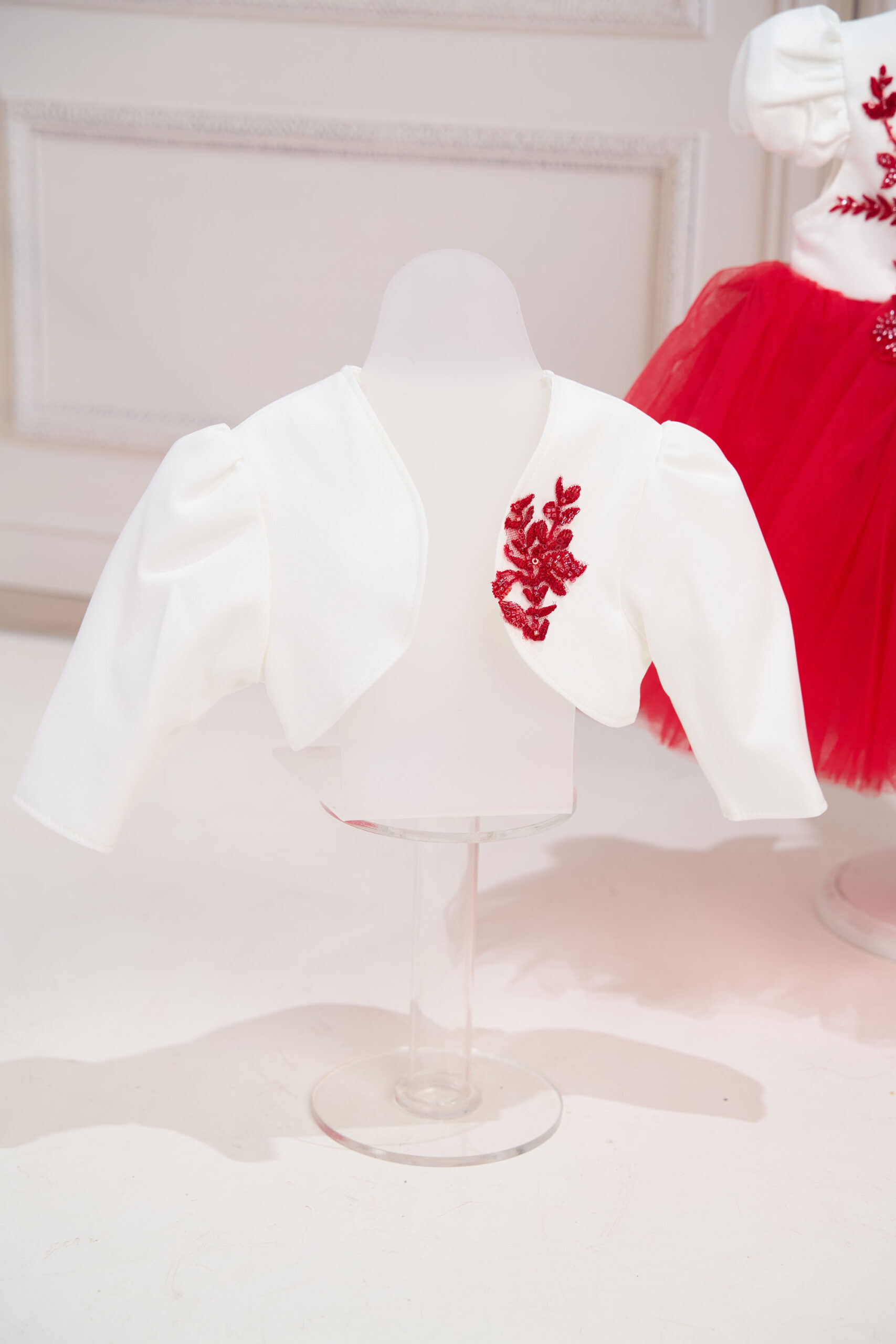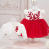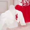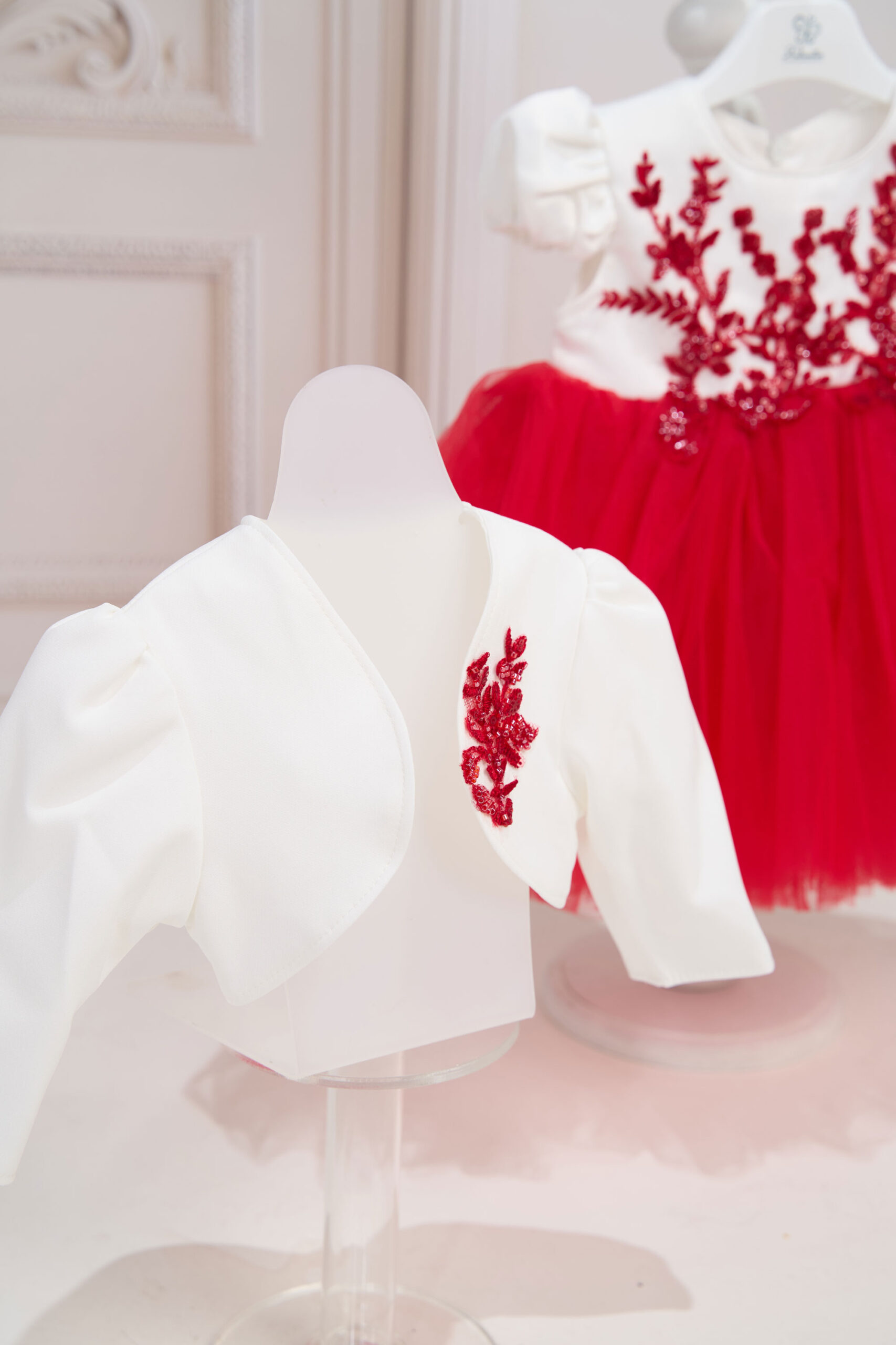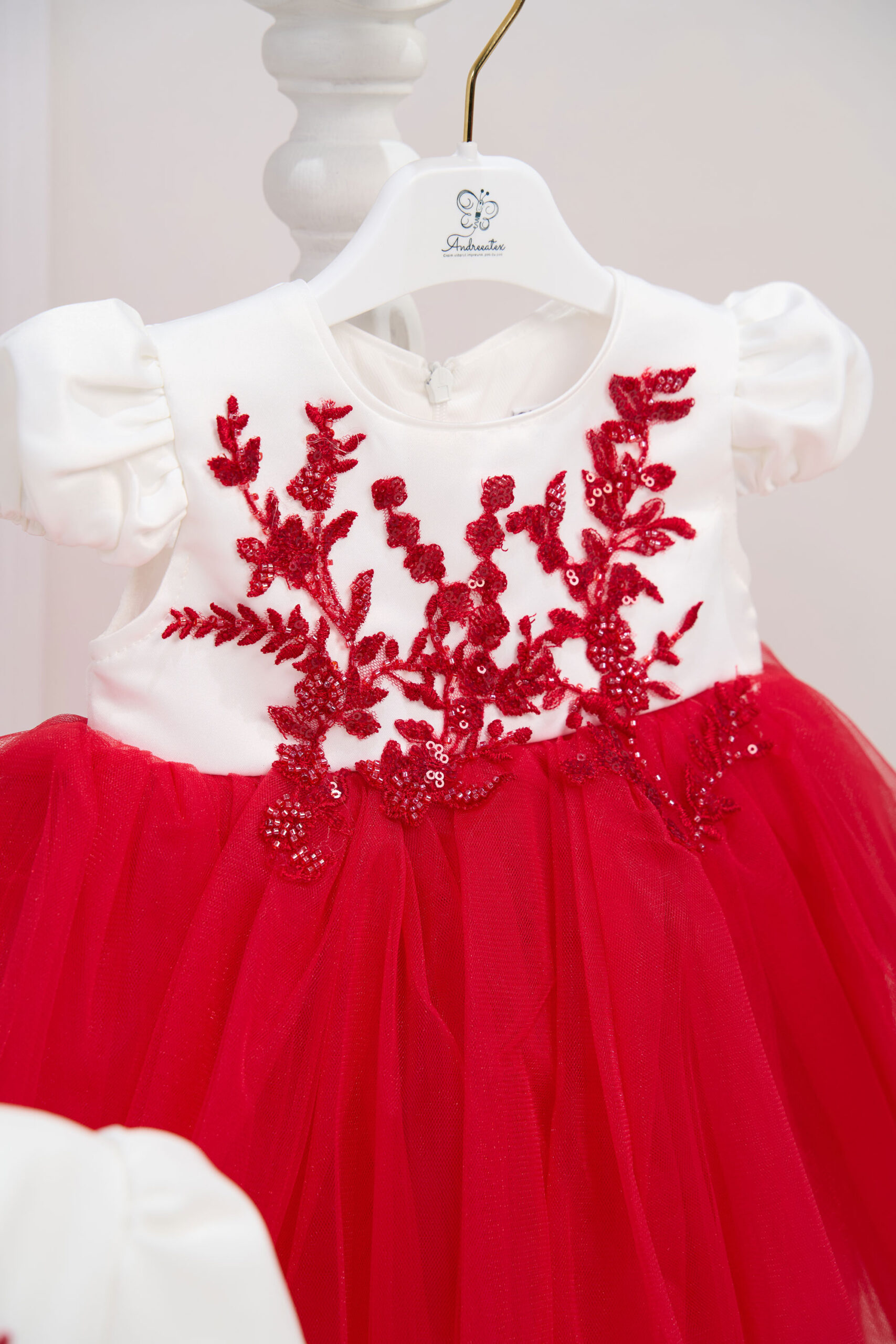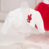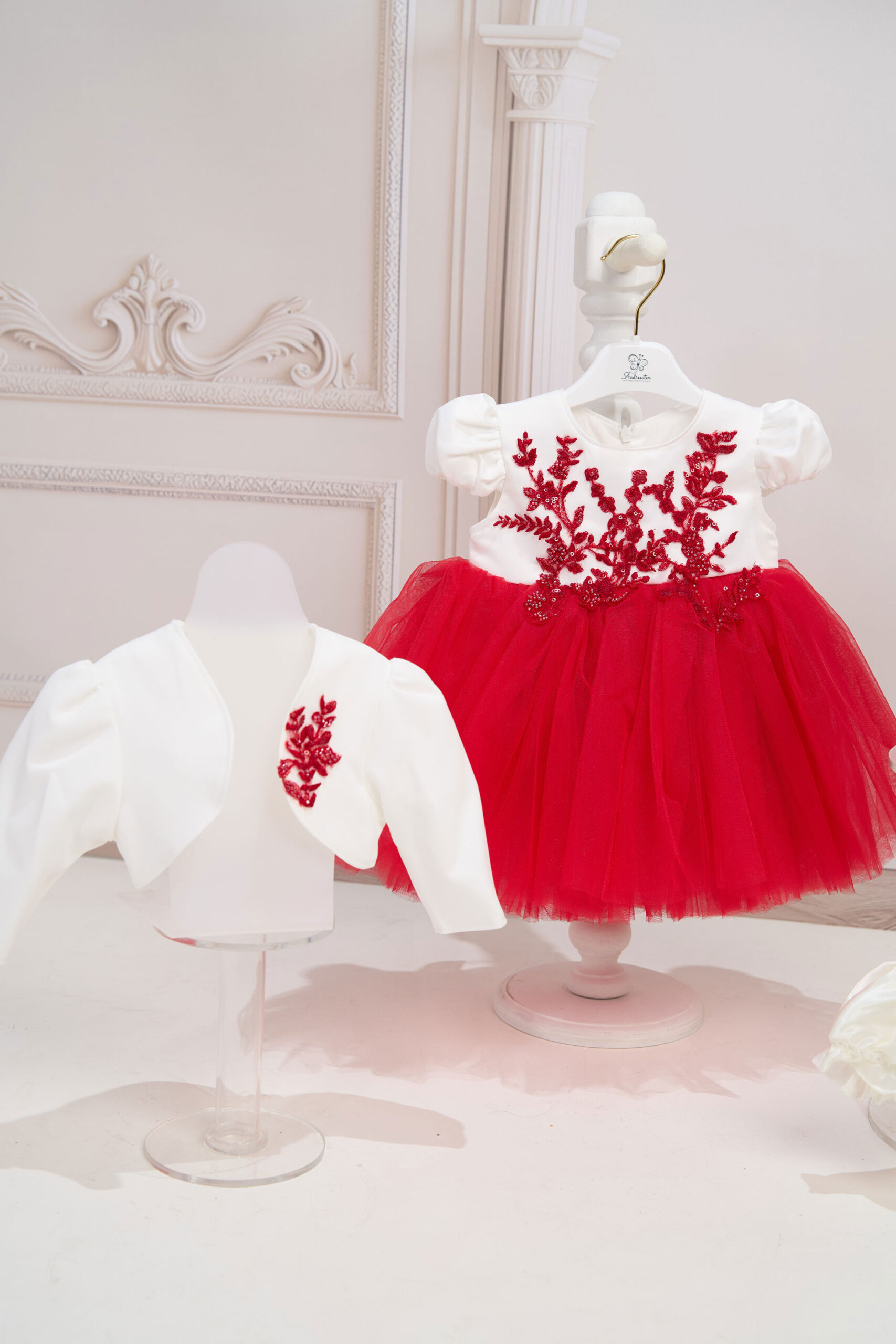 Compleul conține 4 piese: rochiță, bolero, bentiță, chiloței.