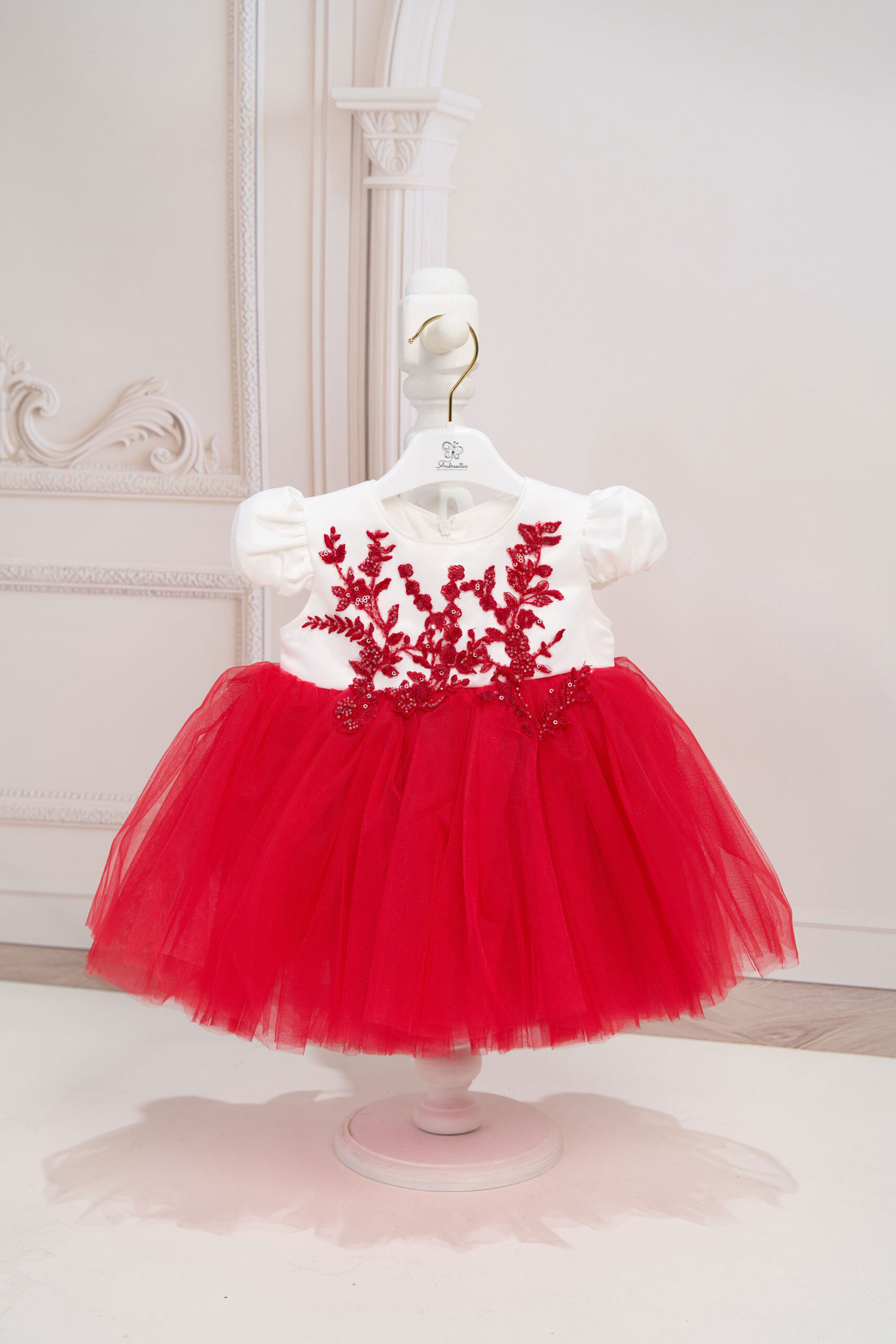 Este o rochiță manufacturată din tafta și multe straturi crețe de tull.