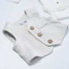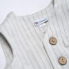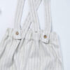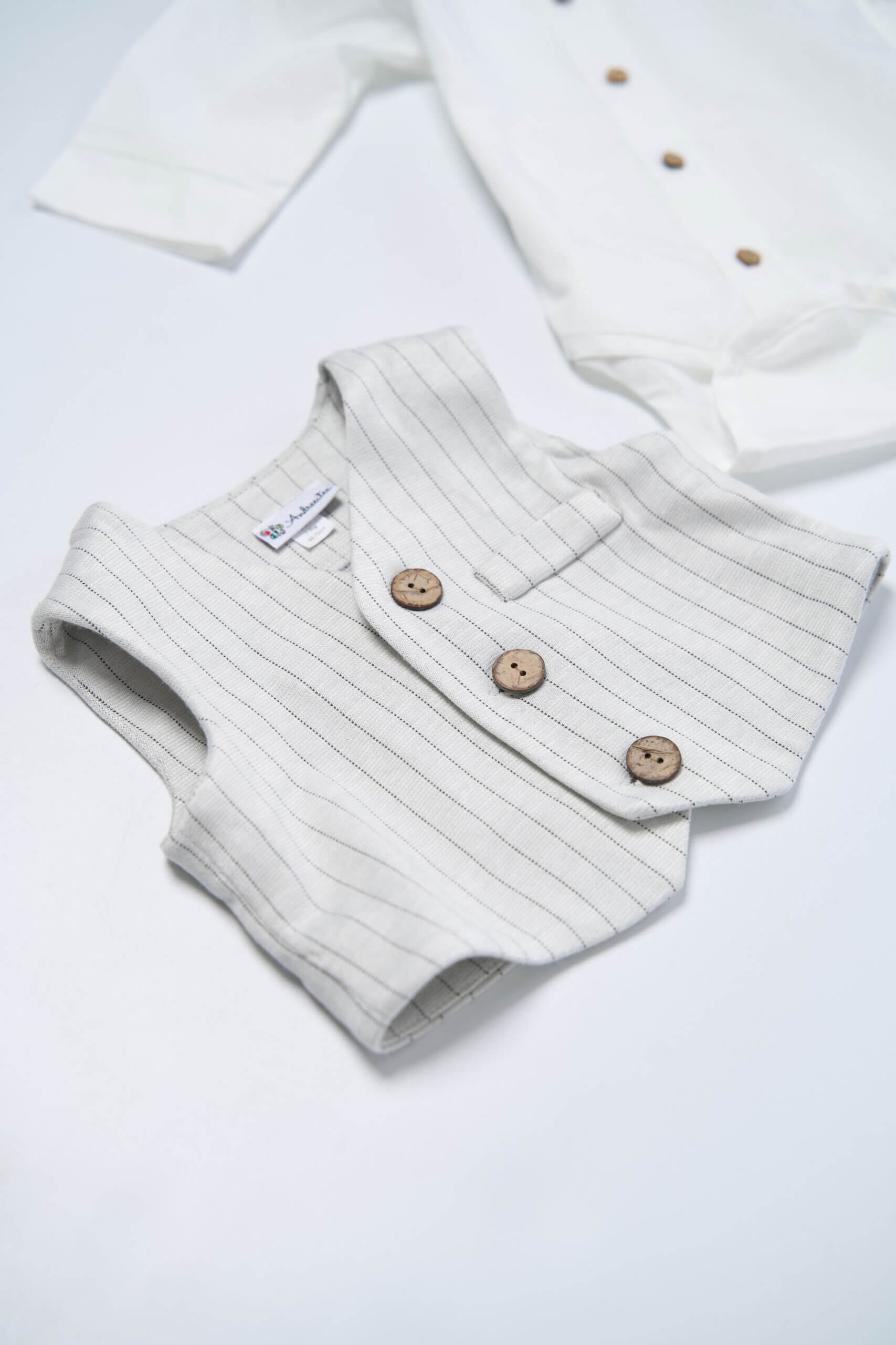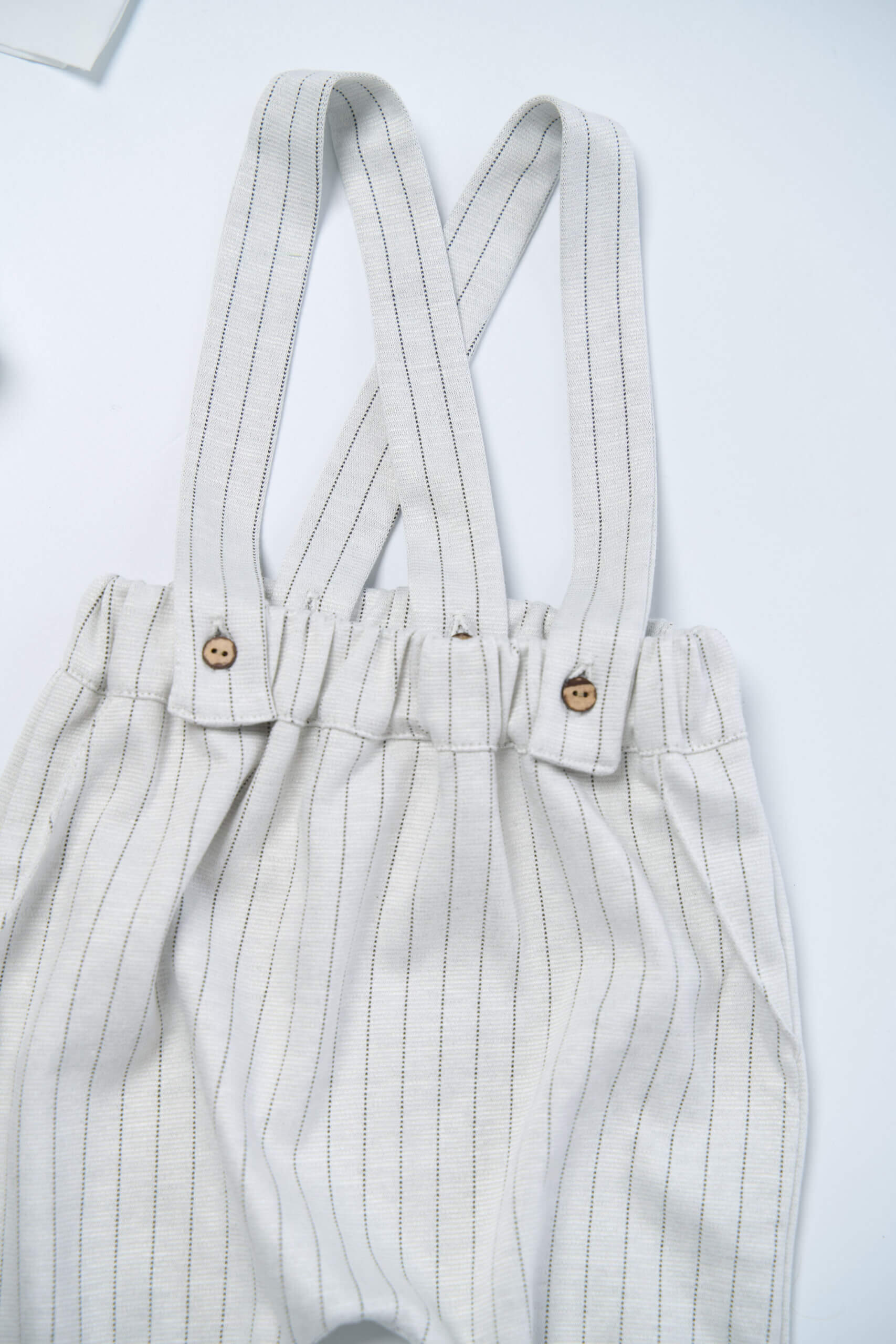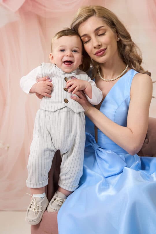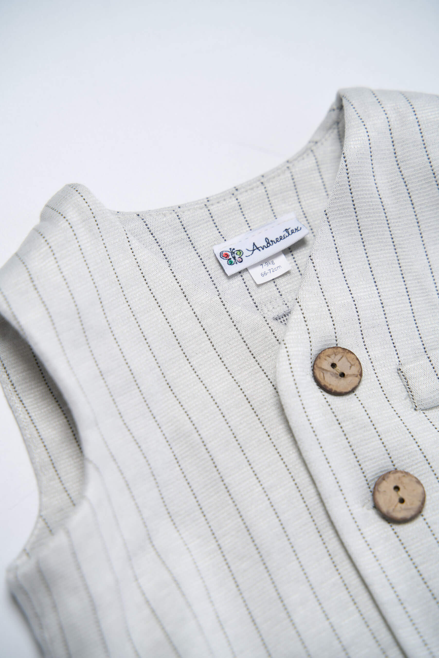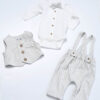 Pantalonii cu bretele și vesta din material în dungi fine adaugă un aer vintage, perfect echilibrat de liniile moderne și croiala lejeră. Costumul este ideal atât pentru ceremonia de botez, cât și pentru momentele de sărbătoare în familie.
