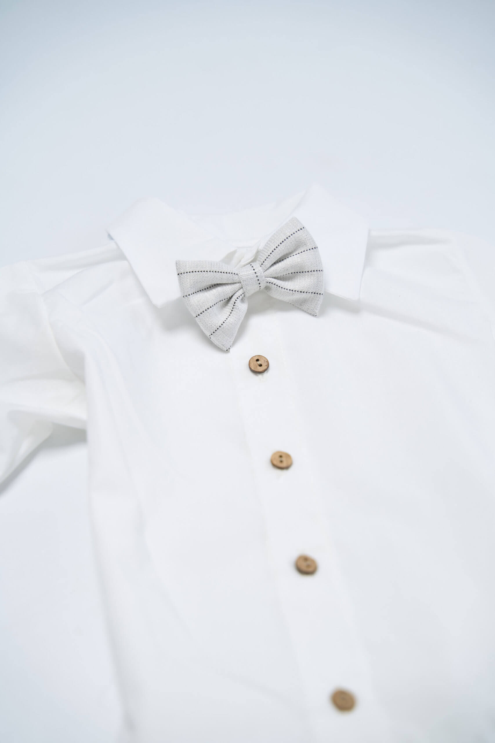 Elegant, natural și plin de rafinament – așa este noul model Aris, gândit pentru micii domni care își încep povestea cu stil. Setul conține o cămașă tip body, practică și confortabilă, cu papion și nasturi din lemn, ce se așază impecabil pe corpul bebelușului, fără să se ridice sau să incomodeze.