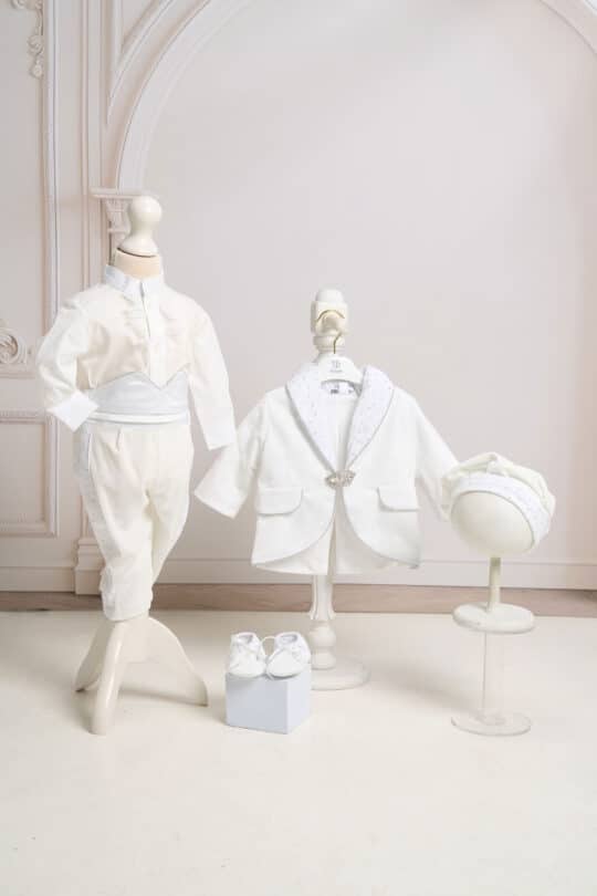 Costumul de botez conține 6 piese: pantaloni, sacou, aripi detașabile, cămașă tip body cu jabou, șepcuță, botoșei.