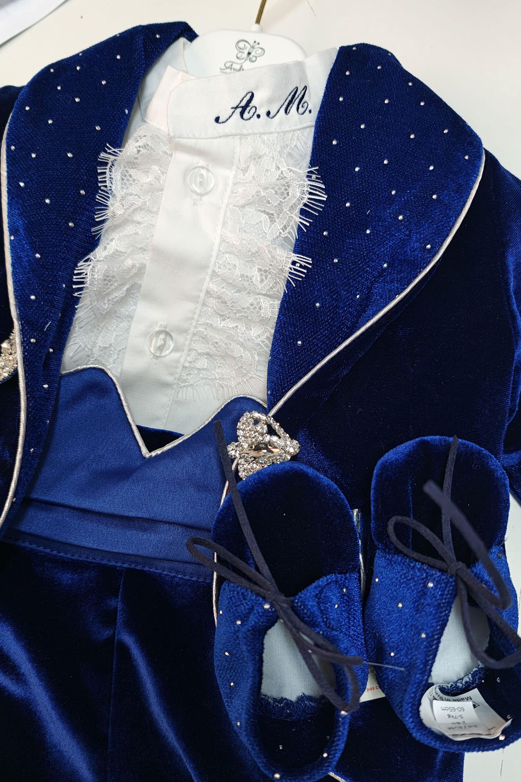 Costumul de botez conține 5 piese: pantaloni, sacou, cămașă tip body cu jabou, șepcuță, botoșei.