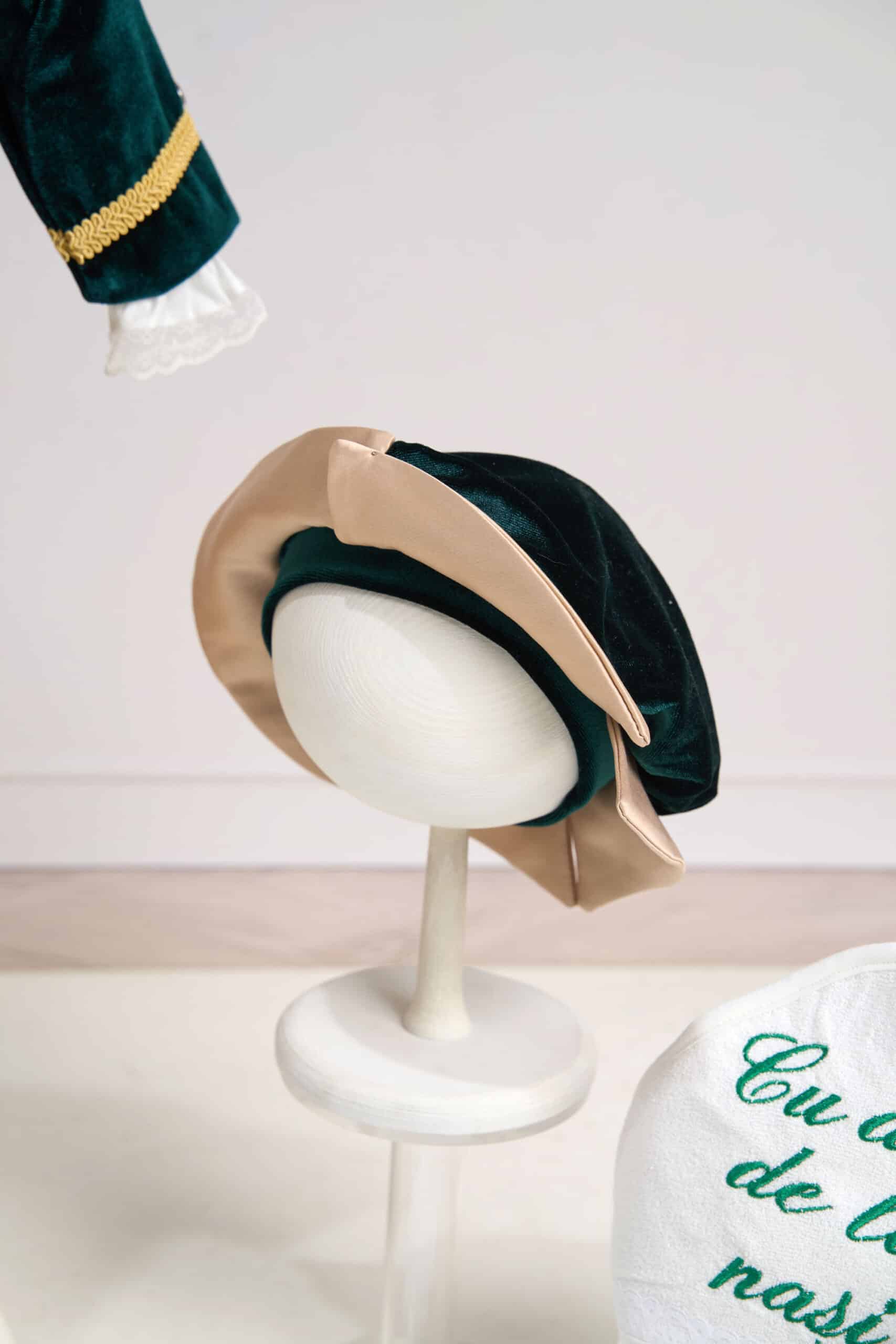 Pălăriuța este creață, din catifea cu boruri de tafta. Sacoul și pălăriuța sunt căptușite lejer, cu căptușeală golf pentru ținuta costumului, celelalte piese ale costumului sunt necăptușite.