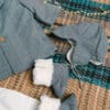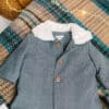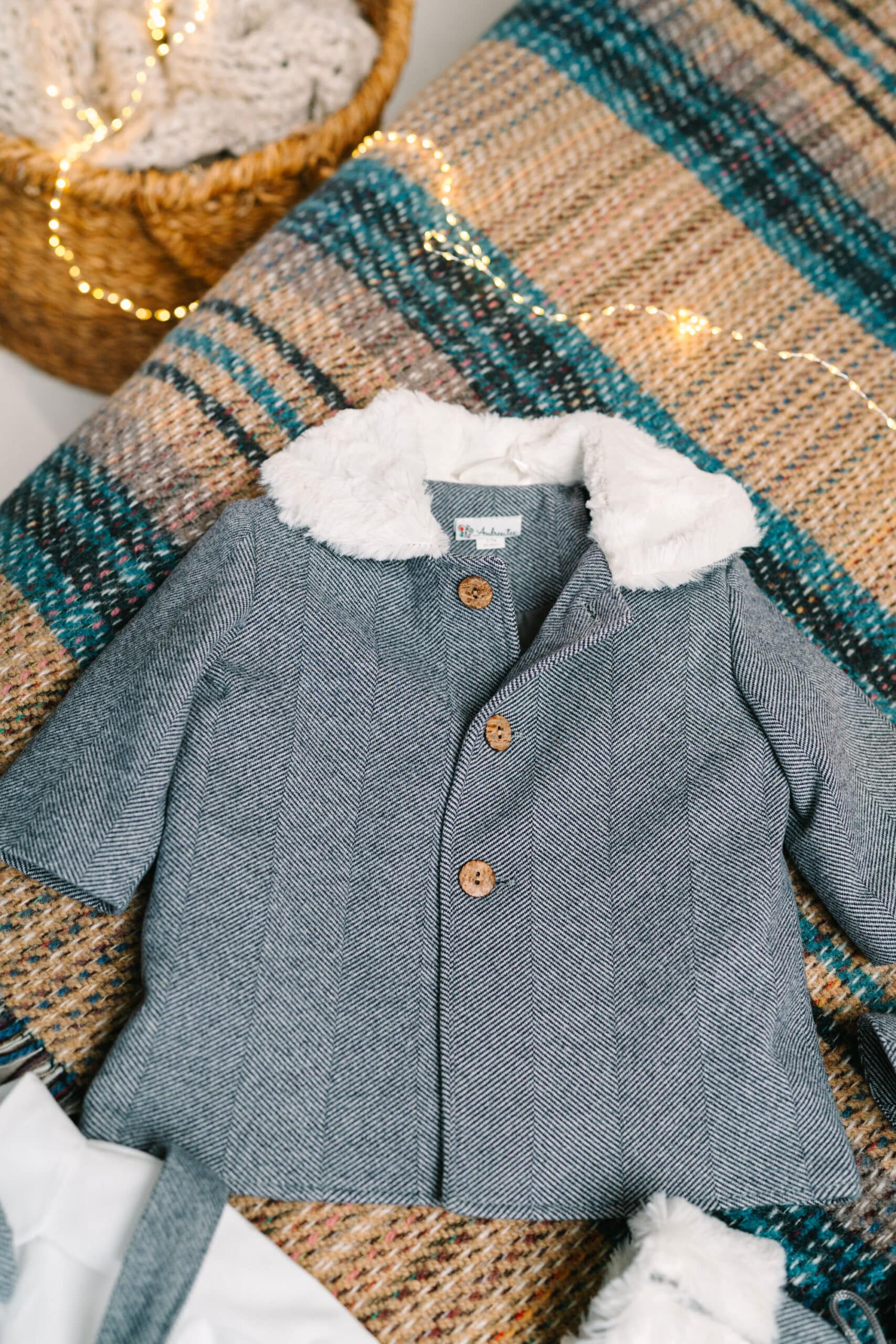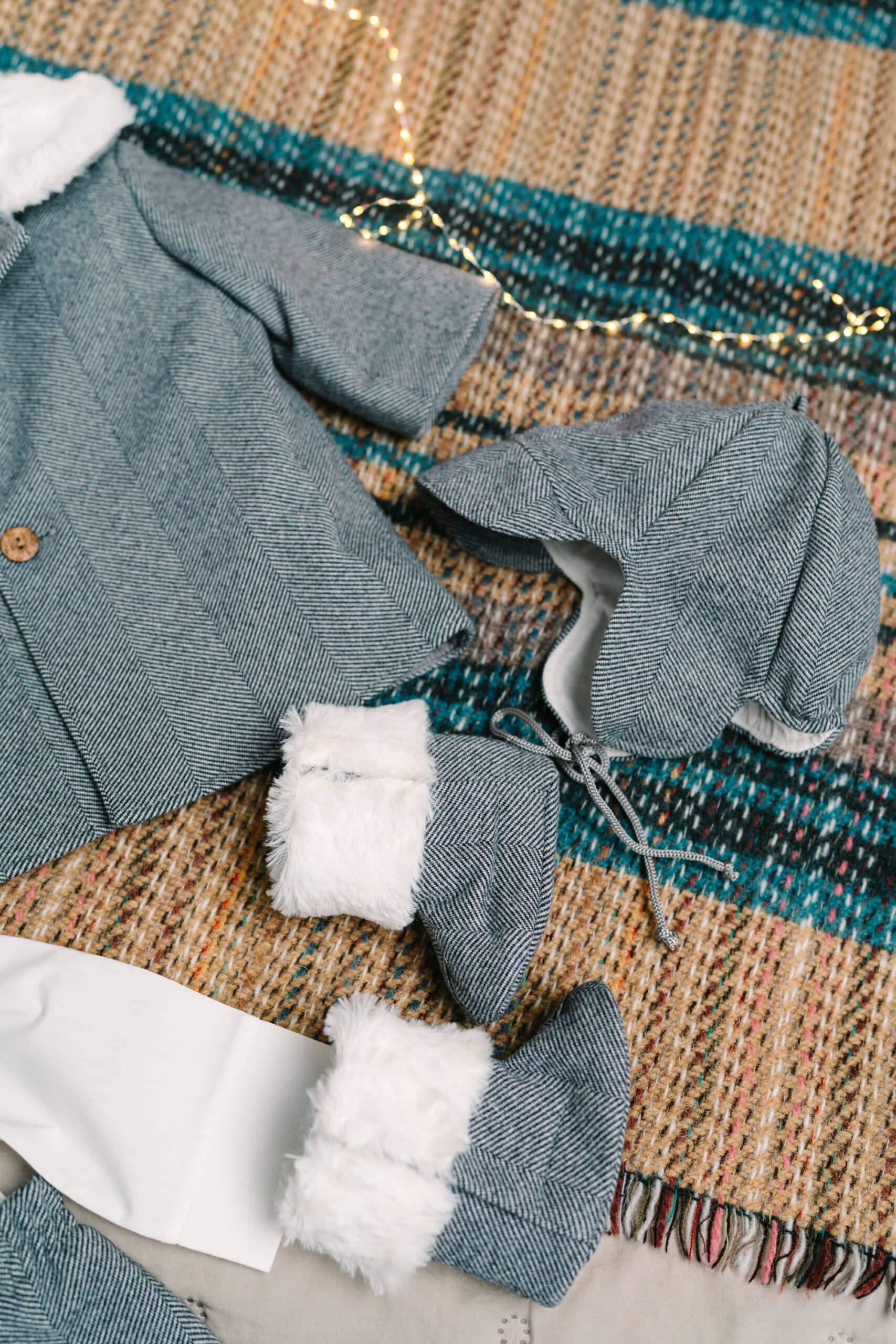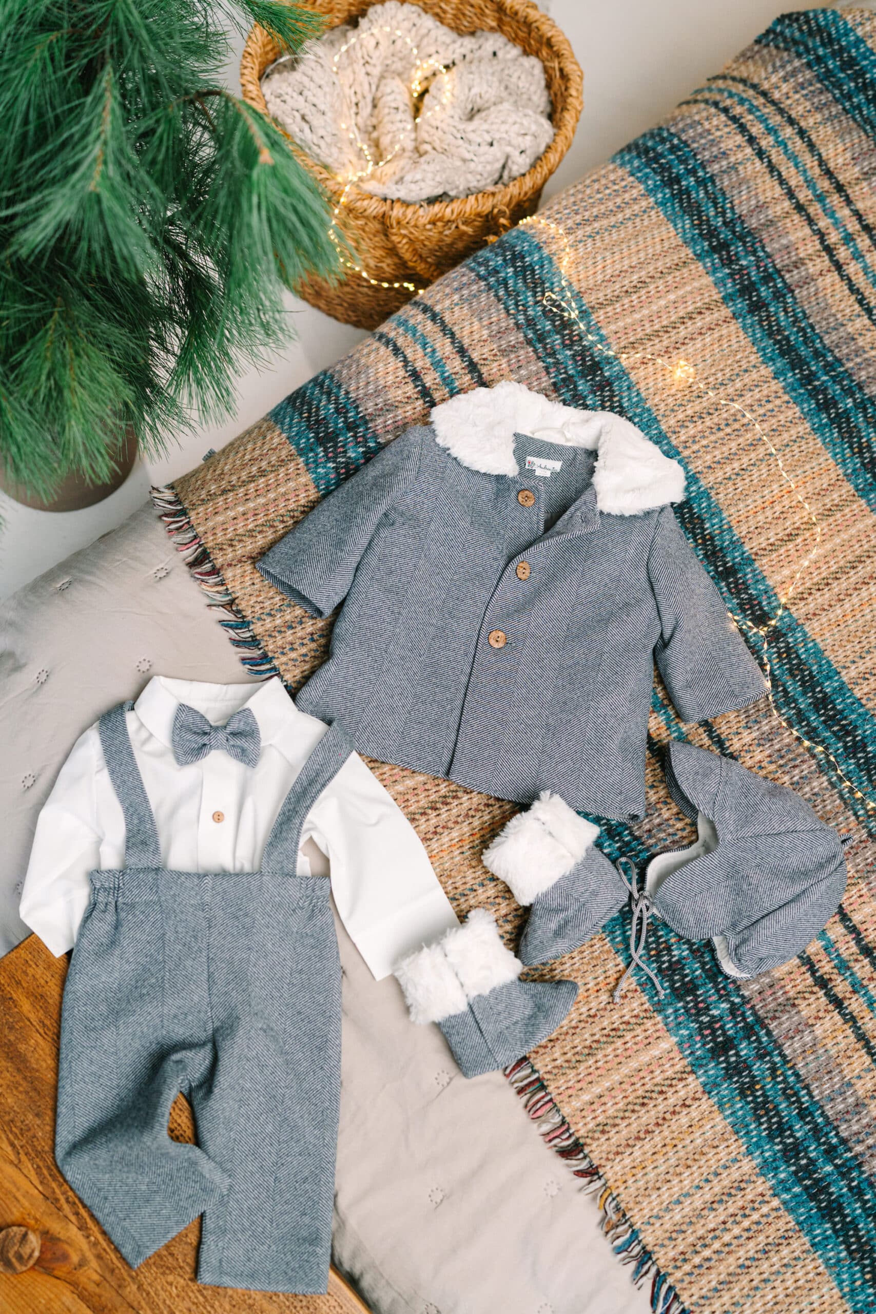 Costum botez cu jachetă călduroasă și pantaloni cu bretele – 6 piese