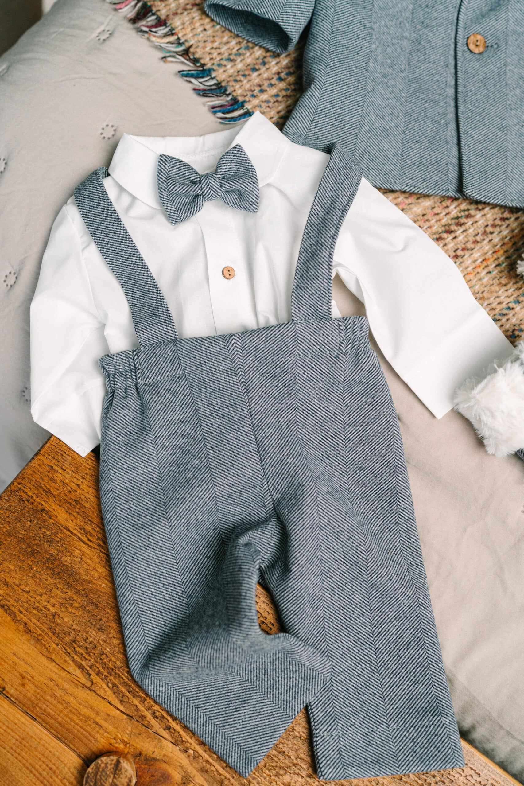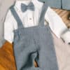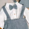 Pantalonii cu bretele completează armonios ținuta, oferind un look clasic și sofisticat, iar papionul asortat adaugă un plus de stil.