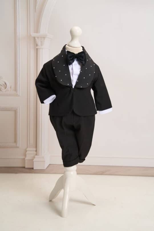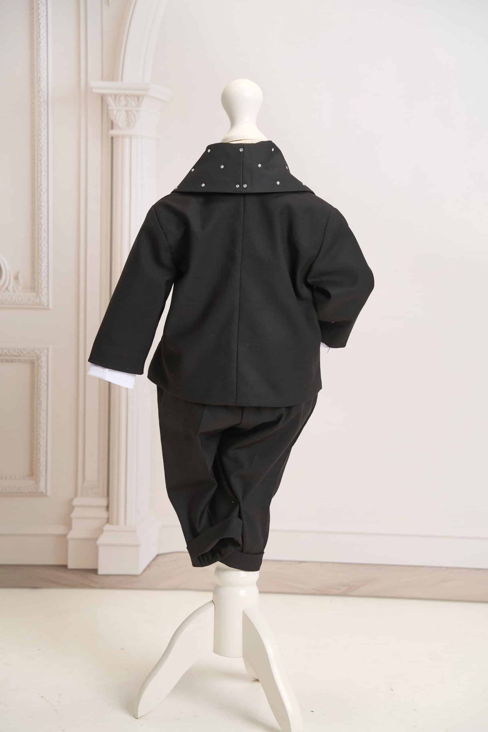 Sacoul elegant este realizat din stofă neagră și se remarcă prin gulerul tip șal, decorat discret cu aplicații strălucitoare, care oferă un aer sofisticat și festiv întregului ansamblu. Croiala este atent gândită pentru a păstra eleganța unui costum clasic, dar și confortul necesar celor mici.