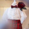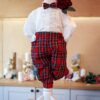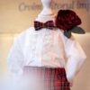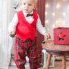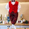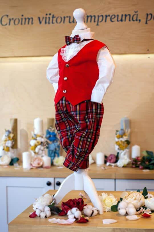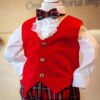 Costum cu vestă roșie cu nasturi aurii, pantaloni și papion tartan, și cămașă cu jabou.