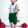 Set compus din pantaloni din in, cu buzunare, șliț și găici, bretele detașabile cu detalii din imitație de piele, elastice, cămașă imprimeu vesel cu nasturi față, cu guler și mânecă scurtă, papion și șapcă.