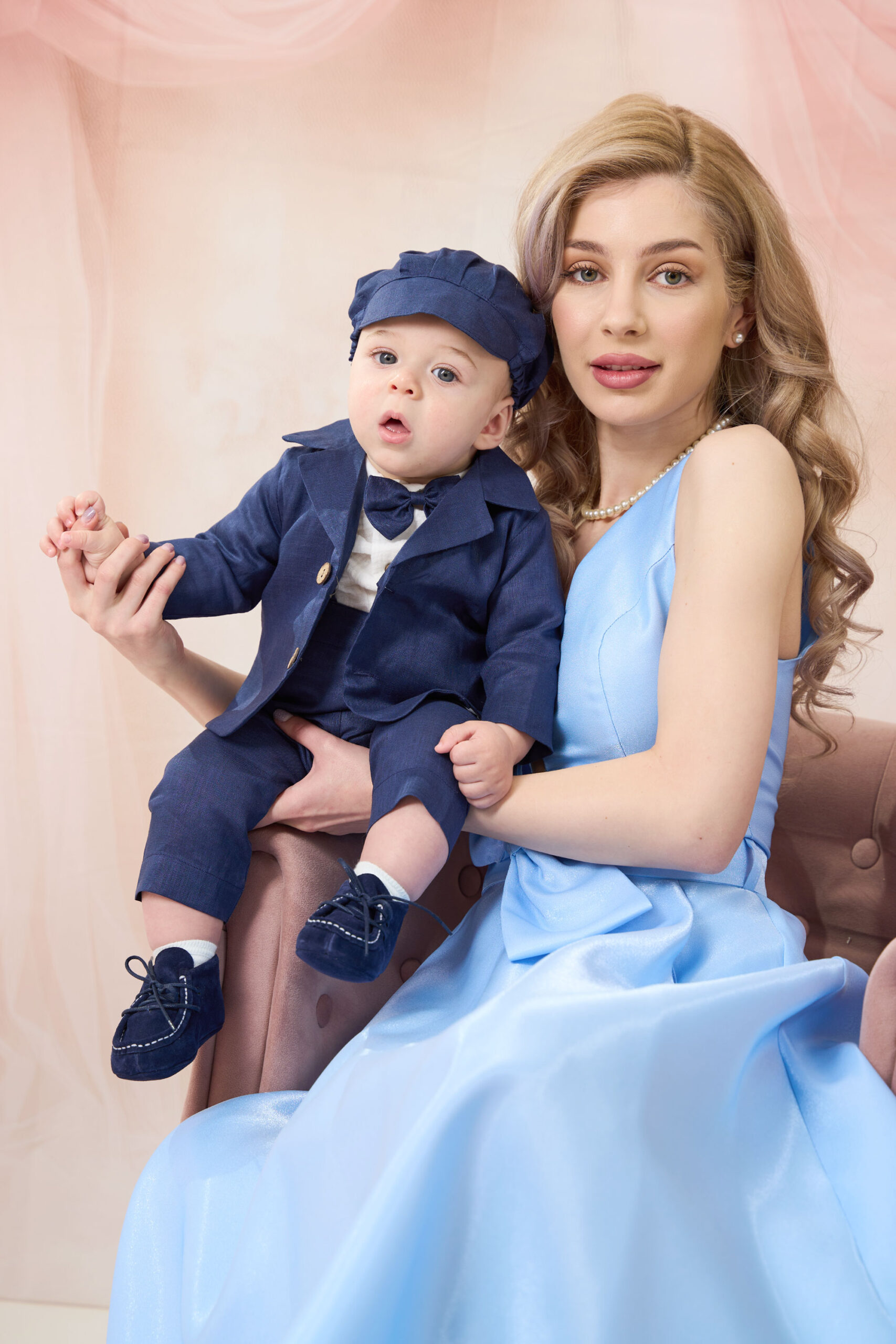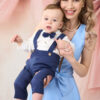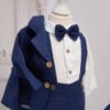 Set compus din 5 piese: Cămașă tip body din muselină, Pantaloni din in cu bretele detașabile, Sacou din in, Papion din in, Șapcă din in cu elastic reglabil.