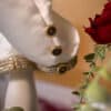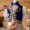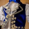 Vestă – Realizată din catifea, vesta este decorată cu aplicații de dantelă aurie și broderie la gât. Gulerul are atașat un jabou din dantelă și este completat de o fundiță din satin înfrumusețat de o decorație aurie tip lacrimă.