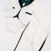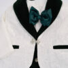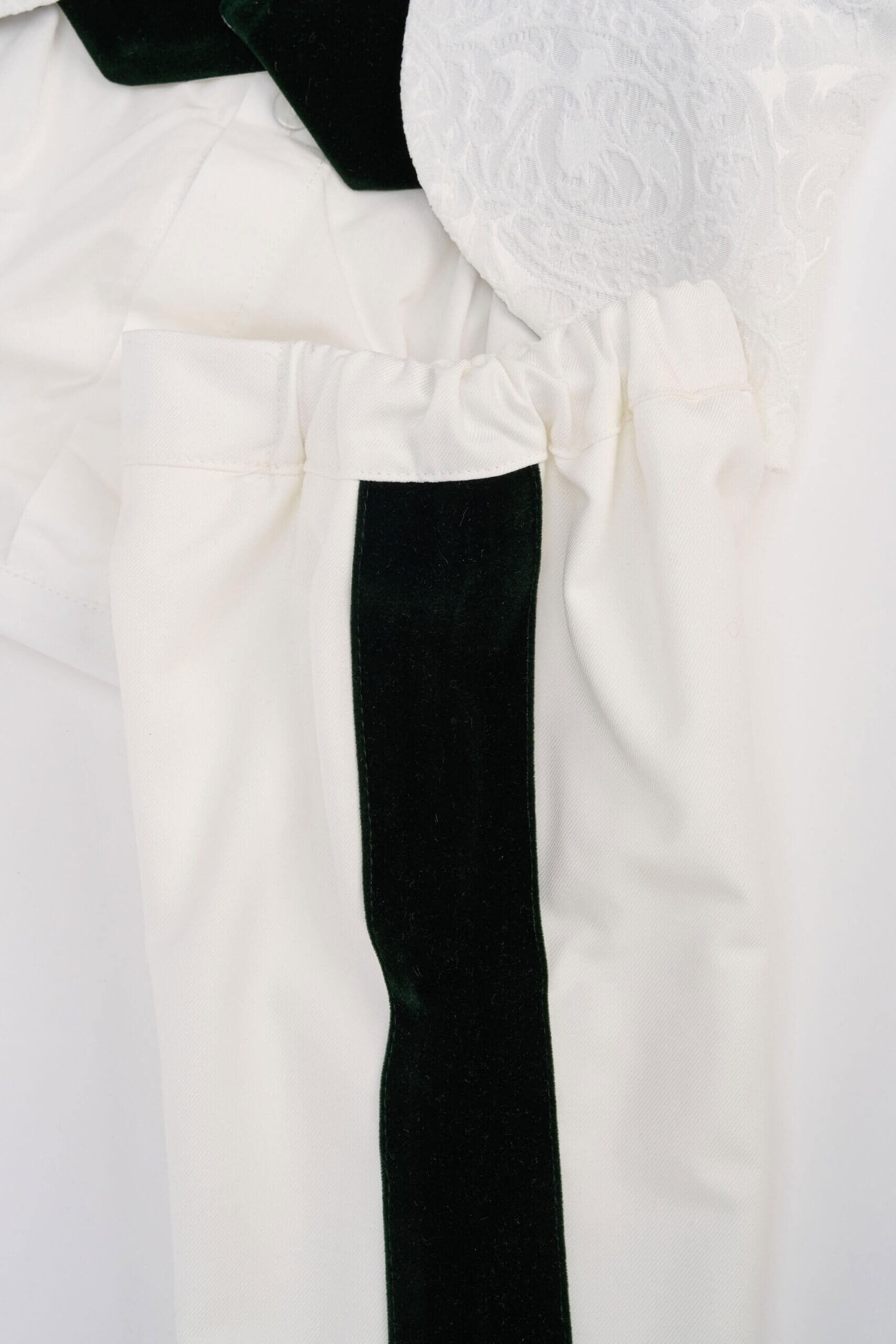 Sacoul din brocart cu model delicat este completat de o vestă din catifea, guler șal și vipușcă pe pantaloni, toate din catifea.