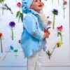 Pălăriuța este creață, cu detaliu broșă cu nasture și pană, ea se așează în valuri peste urechile micului cavaler.