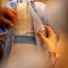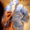 Croiul costumului este redat de dantela bleu, care se așează într-un joc cromatic în simetrie pe piepți.