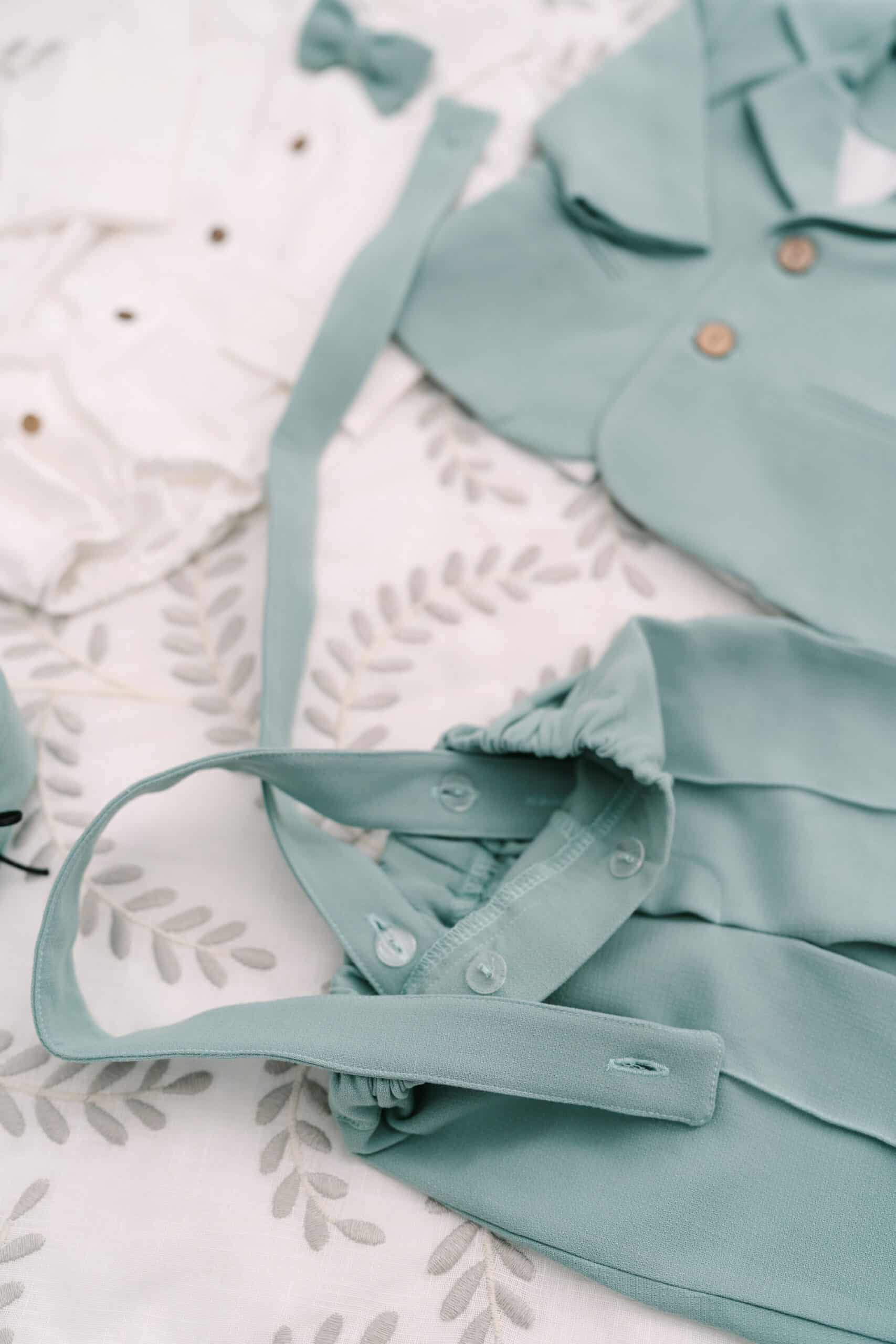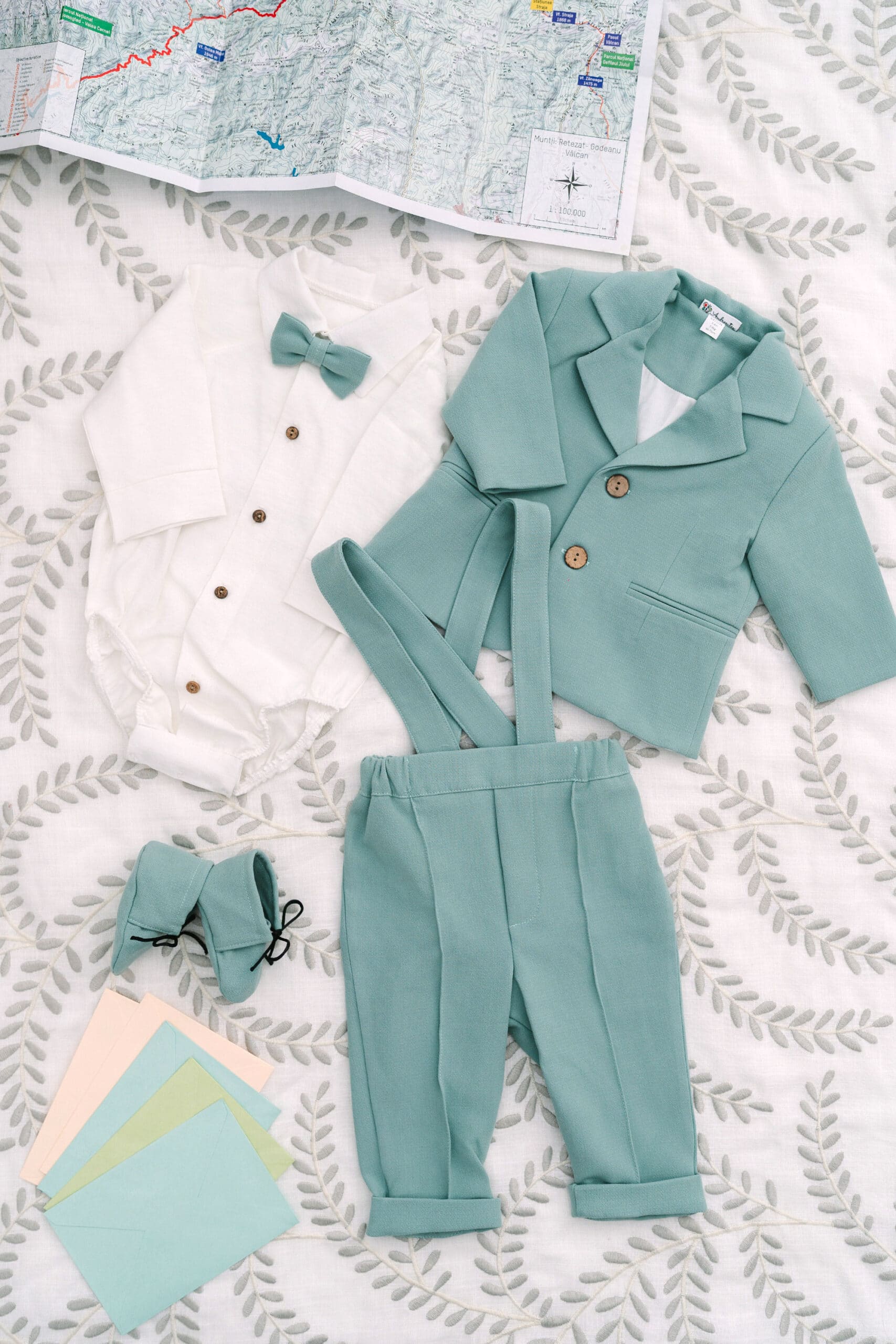 Costum botez băieți cu sacou, pantaloni și body, în verde sau mentă – 6 piese